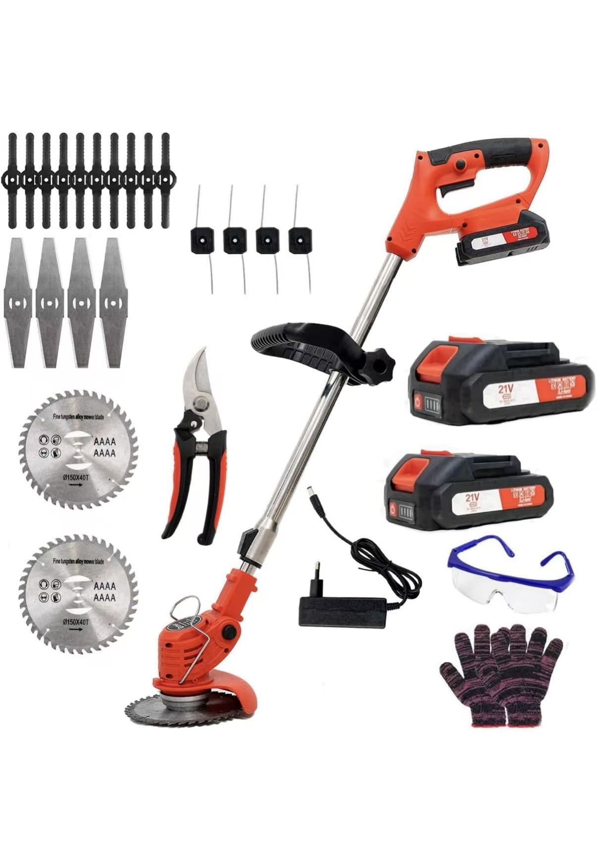 【Cordless String Trimmer】Battery-powered cordless string trimmer with high-performance pure copper motor and a maximum speed of 11000 Rpm. Easily trim weeds and branches in the garden. Equipped with two 21V batteries and a fast charger, it can weed efficiently and easily. 【Lightweight and safe】: The string trimmer weighs only 1.8 kg. The string trimmer has two safety switches and a weeding cover to prevent personal injury caused by accidental startup and flying weeds. There is also an anti-collision device to avoid hitting stones to ensure maximum safety. 【Adjustable length and angle】The telescopic pole of the string trimmer is adjustable, and the length of the electric string trimmer can be freely adjusted between 70 cm and 105 cm; the trimmer cutting head can be adjusted to 5 different angles (0°/22.5°/45°/67.5°/90°). 【4 Blade Combination】The string trimmer is equipped with 4 high-efficiency blades: plastic blade and cutting line suitable for cutting very young grass; right-angle blade suitable for cutting weeds, small shrubs and branches; suitable for cutting thicker grass and trees. 【Packing List】The string trimmer kit includes: 1 string trimmerr, 2*21V battery packs, 1 charger, 2 alloy diamond saw blades, 4 straight blades, 10 plastic blades, 2 grass ropes, equipped with handle scissors, gloves, safety glasses, tool kit.