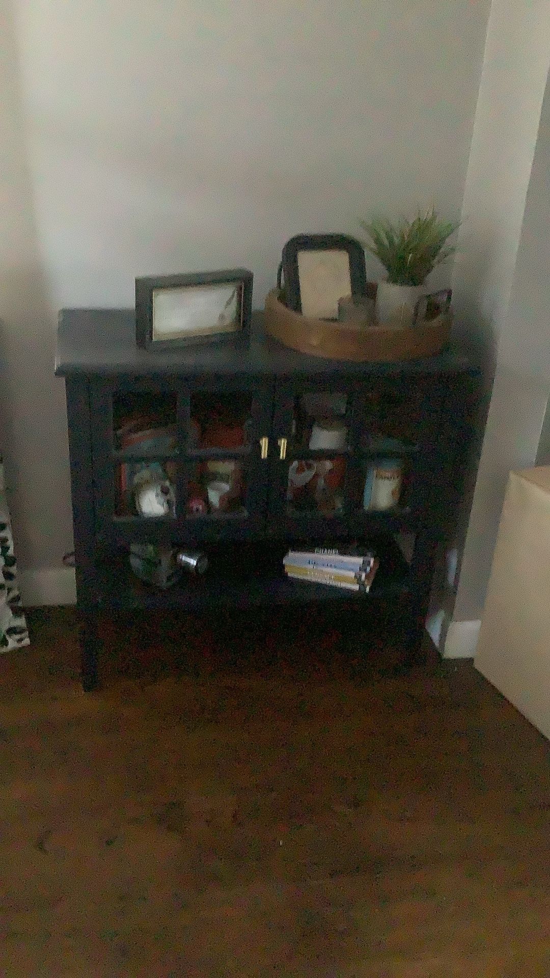This item if freshly painted with brand new hardware. Color is dark navy.