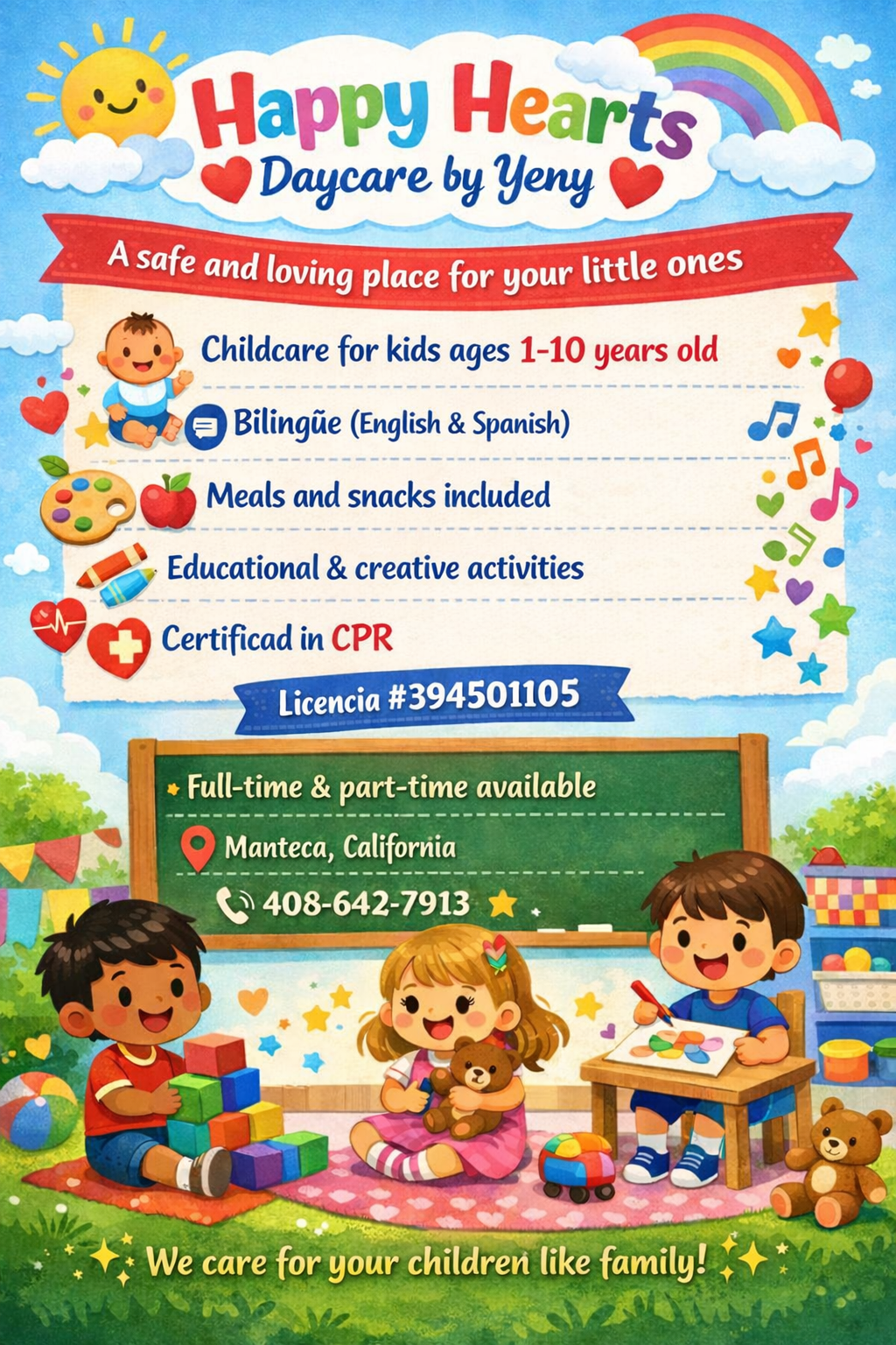 🌟 Happy Hearts Daycare by Yeny 🌟 ❤️ Un lugar seguro y lleno de amor para sus pequeños. 👶 Cuidado infantil para niños de 0-10 años 🗣️ Bilingüe (Español e Inglés) 🍎 Comidas y snacks incluidos 🎨 Actividades educativas y creativas todos los días 🩹 Certificada en CPR 📋 Licencia #(contact info removed)05 ⏰ Tiempo completo y medio tiempo disponible 📍 Manteca, California 📞 (contact info removed) ✨ Cuidamos a sus hijos como familia ✨