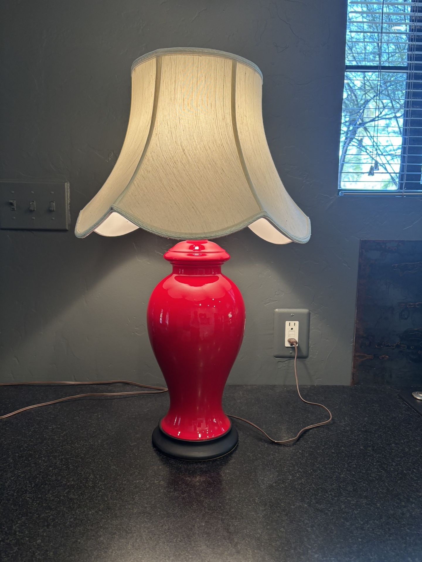 Ceramic bell jar with wooden base, original power cord, in-line and socket switches, 3-way bulb ready. Deep Cherry Red high gloss ceramic base, fabric shade, no finial (I’m using a nut, lol) Measures 25.5” tall by 16.5” wide Cash and pick up at Central and Camelback in Phoenix