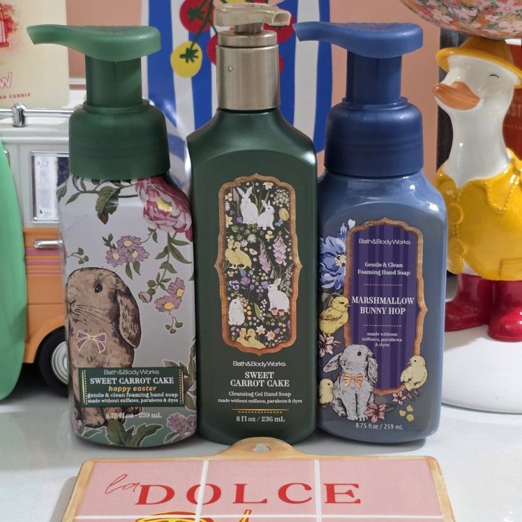 Brand new. 1 Gentle Foaming Hand Soap 2 Cleansing Gel Hand Soap Although it's an Easter scent, it smells lovely year round! Tags spring Easter Striped decor fun summer bunny rabbit decorating warm inviting hop egg hunt kids toddlers girls adults carrot cake carrots fruits veggies farming healthy cute outdoor nature yum yummy health happy joy joyful emotions