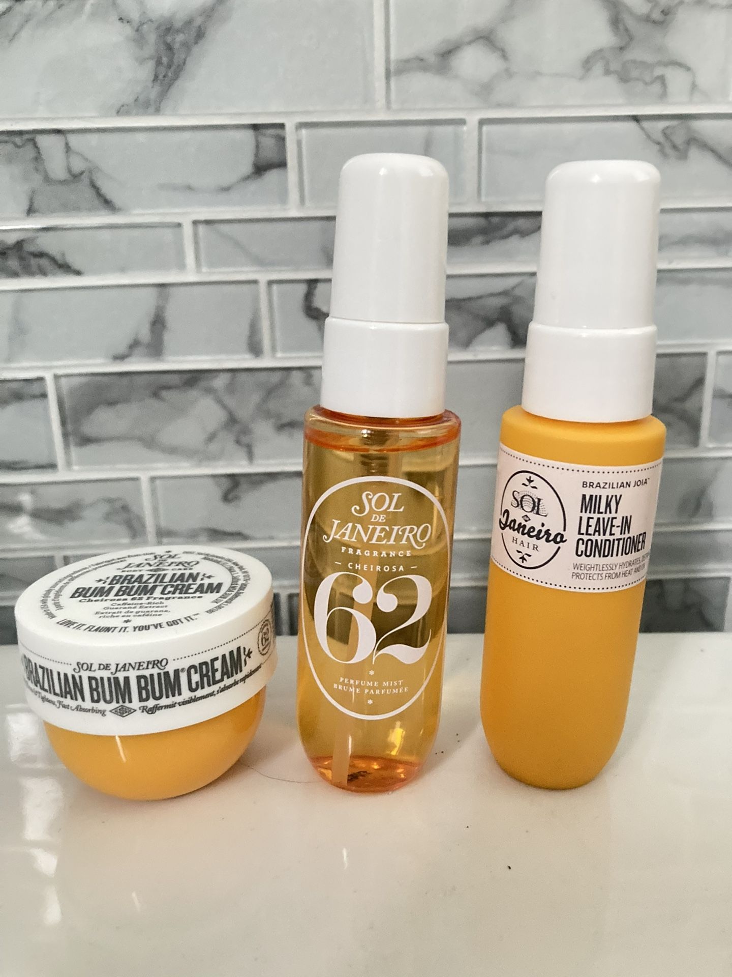 Brand new, unused and in original packaging. This Sol de Janeiro Set Contains: - Brazilian Bum Bum Cream (25 mL) - Cheirosa 62 Perfume Mist (30 mL) - Milky Leave-in Conditioner (30 mL) Will not separate bundle. Since these are personal care products, all sales final.