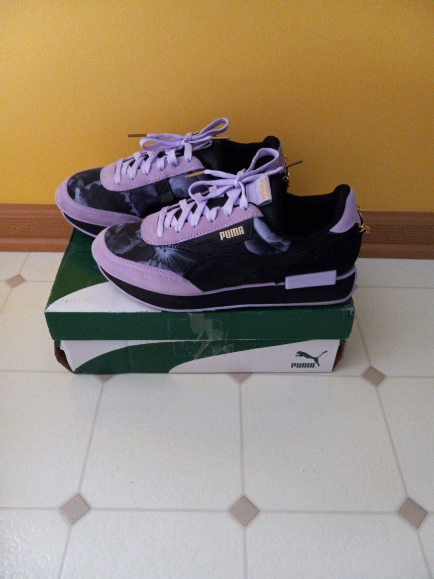 Women's Puma Future Rider DD sneaker, size 8, black/light lavender, in excellent condition, light use. Features super light padded nylon, suede embellishments and shock absorbing Puma outsole. Gold chain embellishment on the back of the shoe and gold colored tip on the shoelaces. Smoke free, pet free home.