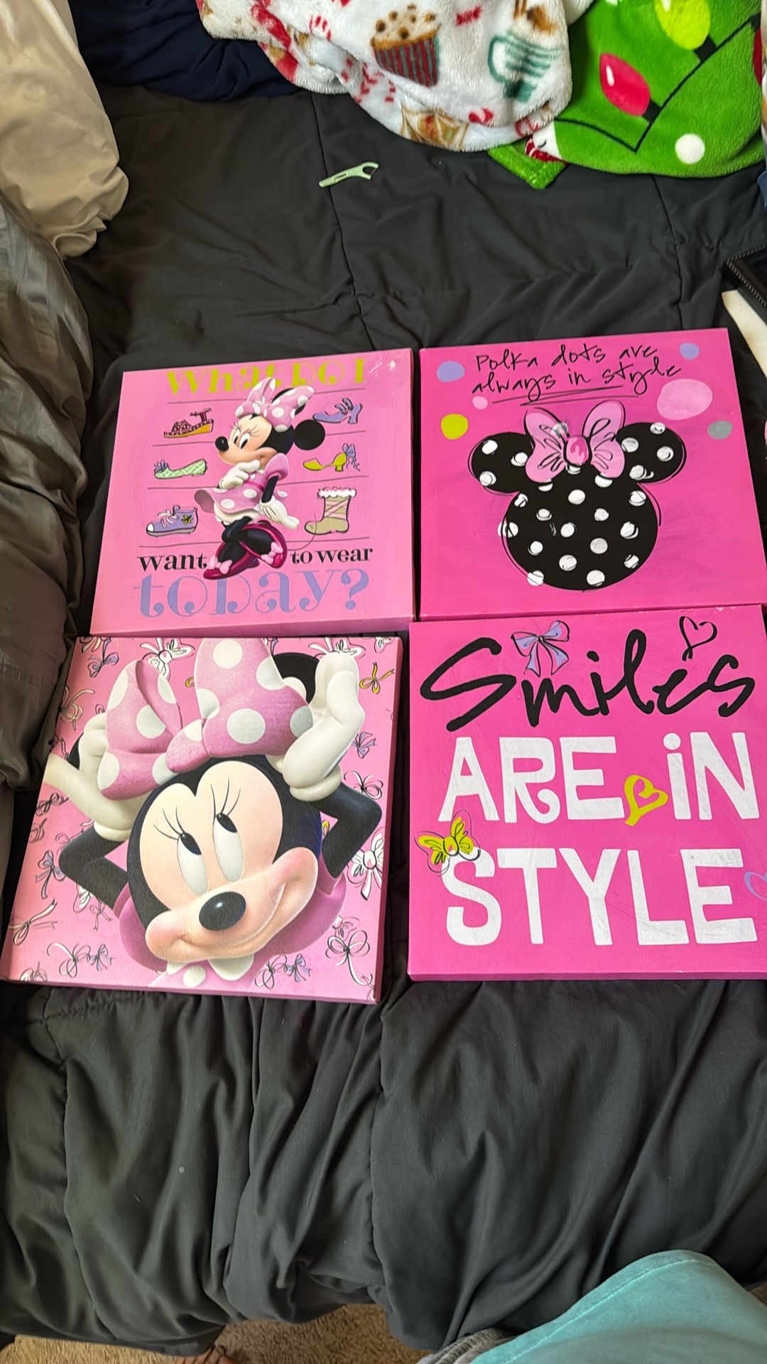 From Disney store: 4 canvases all 11.5x11.5 all ready with brackets to be hung. Were our daughters….outgrew that phase. Newer but some minor wear but great for little one! In lake nona are to meet or pick up