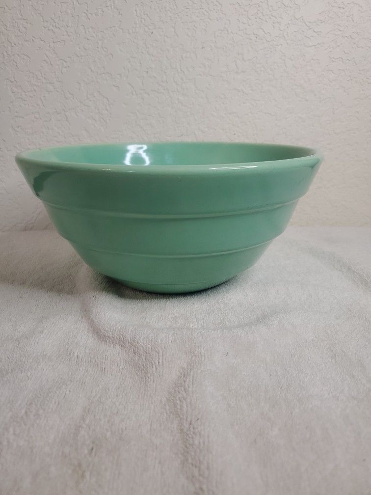 Primitive Antique Beehive style mixing bowl Mint green Bottom reads USA 12 Please note: There are some discoloration brown spots inside the bowl as well as 2 minor flea bites to the rim. Please refer to the pictures