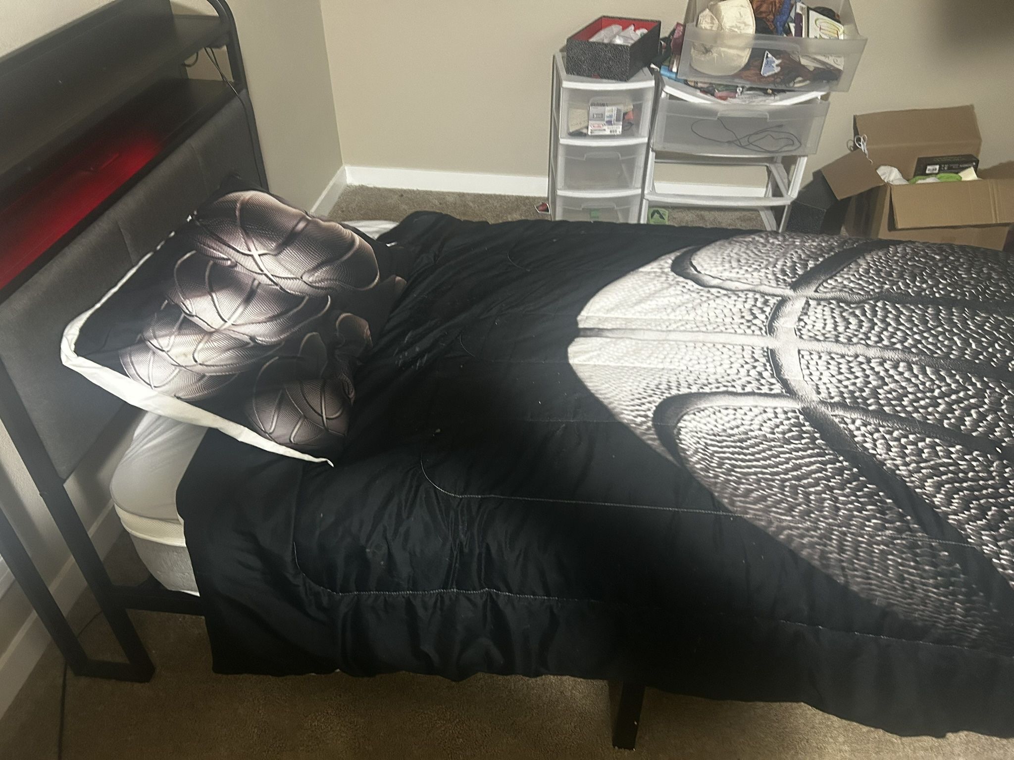 Two LED w/ USB outlet metal and dark grey Twin beds w/mattress for sale. Recently purchased mattresses . 2 drawer nightstand included bottom drawer is a little misaligned. No box spring needed.