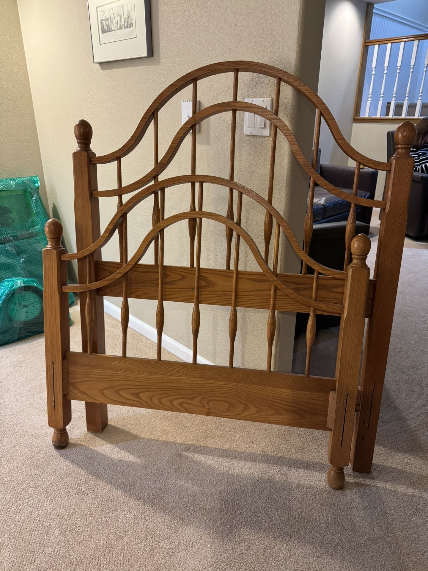 Beautiful solid wood twin bed headboard and footboard for sale (matching dresser and nightstand also listed!). Features a classic curved spindle design with warm wood tones. Perfect for a child’s room, guest room, or cabin-style space. Size: Twin (both pieces are 42” wide; headboard is 51.5” tall, footboard is 39.5” tall) Material: Solid wood Includes: Headboard and footboard (side rails not included) Condition: Very good, sturdy, no cracks or damage Color: Natural wood finish Pickup only in Littleton, CO. $90 OBO. Cash / Venmo / Zelle accepted. Message me if interested or if you have questions!