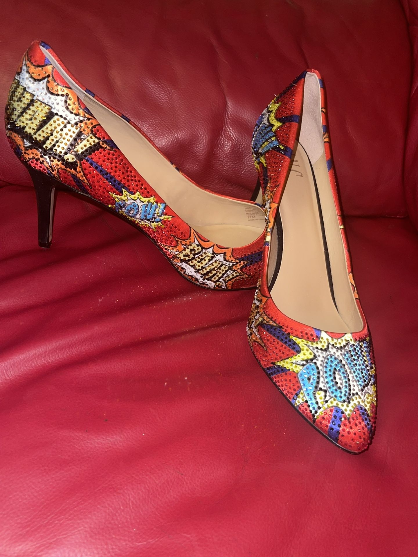 EUC, size 11M, without box. Worn twice, indoors, but alas, I can't wear heels anymore, so these surprisingly comfy beauties need to find a new home. INC International Concepts Inc. Women's Zitah Pointed Toe POW Bling Pumps, created exclusively for Macy's. Satin fabric covered print of classic comic book superhero catch phrases, with rhinestone accents, and a padded footbed. Pow! Bam! Wham! Perfect pop of color and moxie to liven up staid business attire or as the focal point to a memorable outfit.