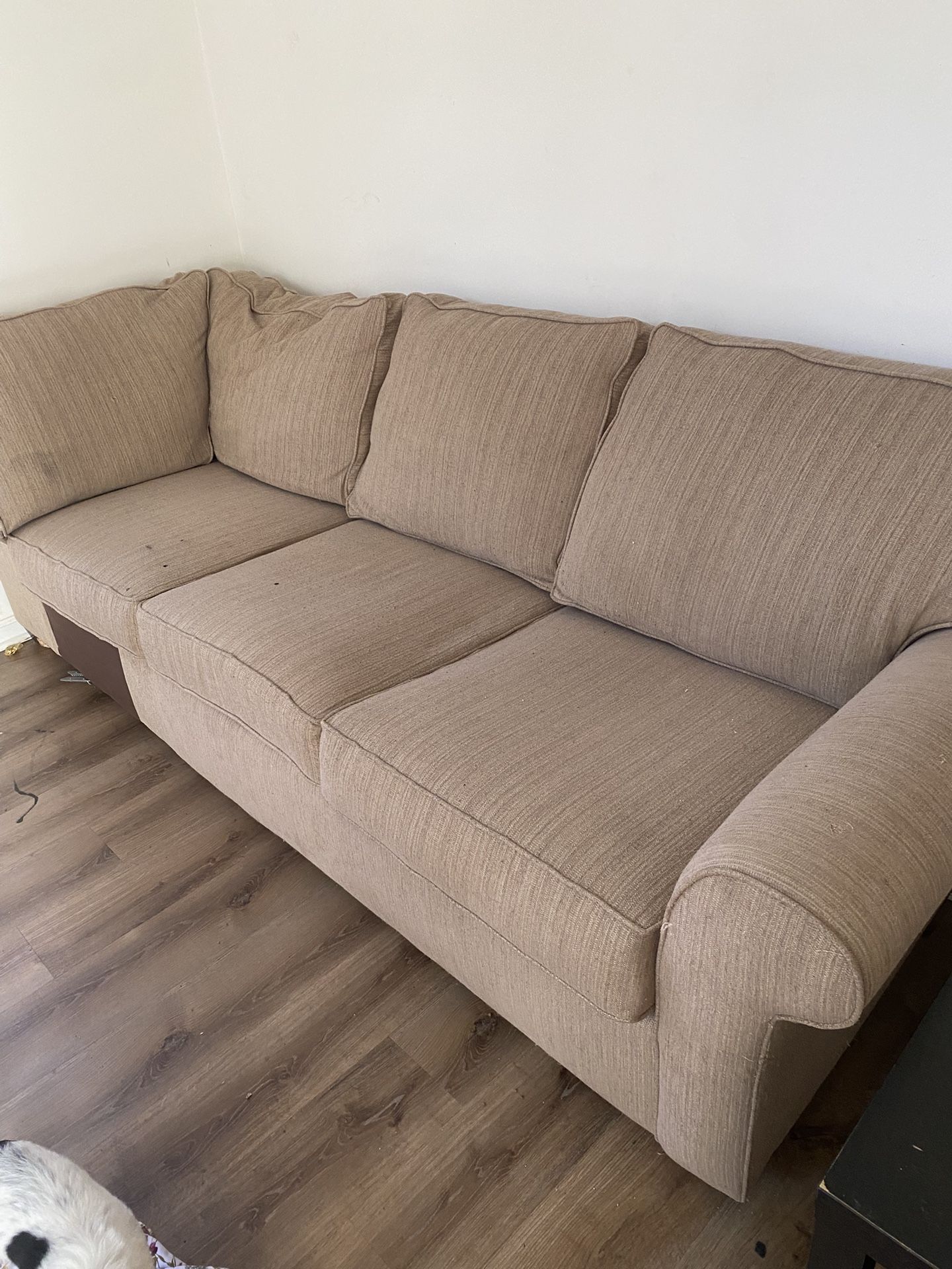 Ive had it for 6 months it’s in great condition im moving and can not take it with me. Ive kept sheets on cushions to keep from being damaged. Pick up only. It can be connected into an “L” shape or separated in two parts.