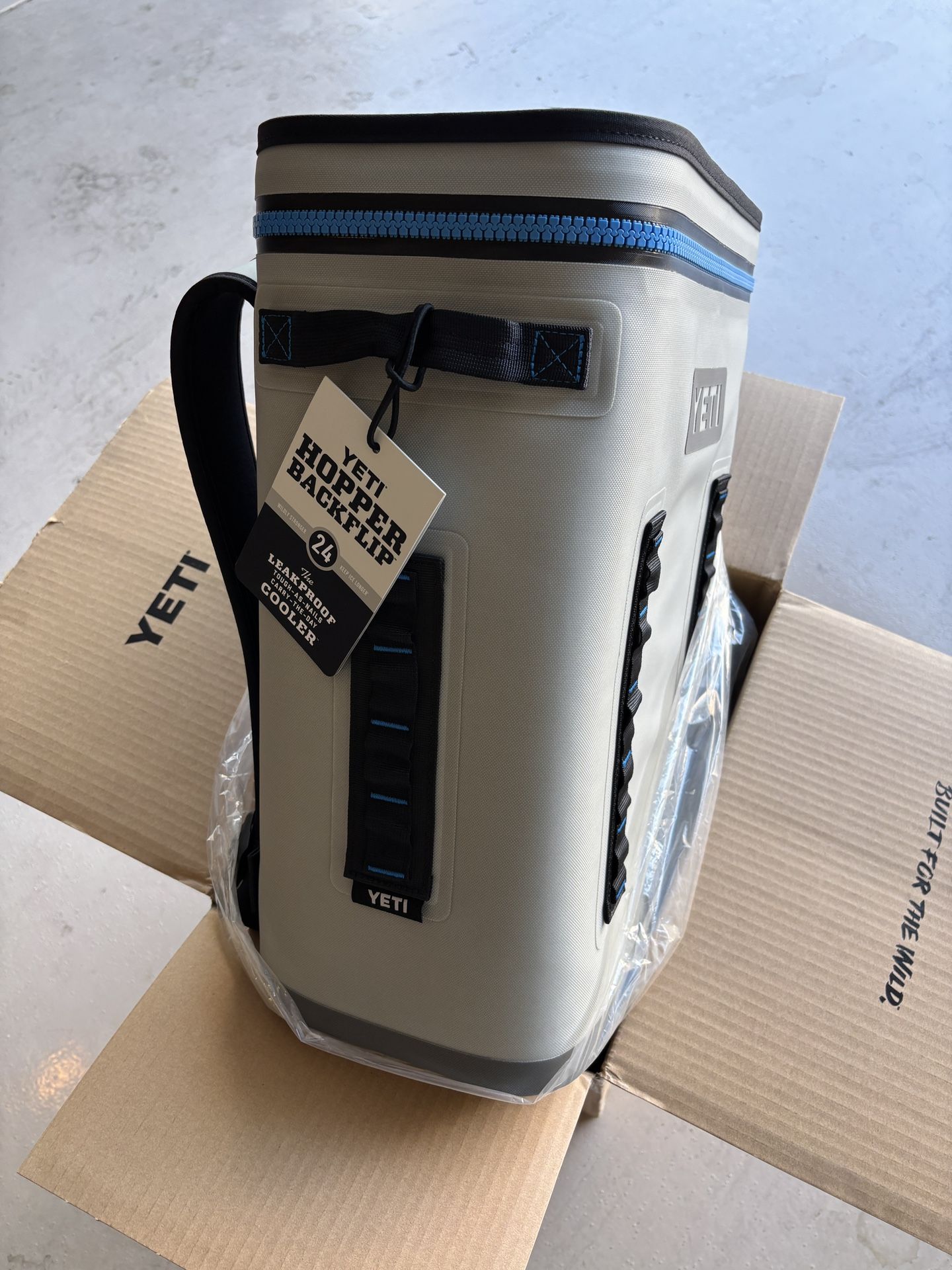 New, never used YETI Hopper BackFlip 24 soft-sided backpack cooler in the classic Fog Gray/Tahoe Blue colorway! - Open box but pristine condition – still has original tags, stickers, and protective bag - Tough to find this model any,ore, let alone new! - Hands-free backpack design with ergonomic straps, removable chest strap, and waist belt for comfortable carrying - Leakproof HydroLok zipper, puncture-resistant DryHide shell, and superior ColdCell insulation - Holds up to 20 cans with ice – perfect for hiking, beach days, fishing, tailgating, camping, or picnics This is essentially brand new – box has been opened to verify condition but never used. Amazing YETI quality at a fraction of the original price. Asking $250. Pickup only (message for location). Cash preferred. Serious buyers only – first come, first served! Message me with questions or for more photos.