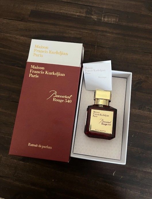 This is a Maison Francis Kurkdjian Eau de Parfum in Baccarat Rouge 540 scent, made in France. The 2.4 fl oz spray bottle is suitable for both men and women. The fragrance features woody, almond, amber, warm spicy, and musky notes, offering a long-lasting scent experience. The product is new in box, perfect for those looking for a luxurious and versatile fragrance option.