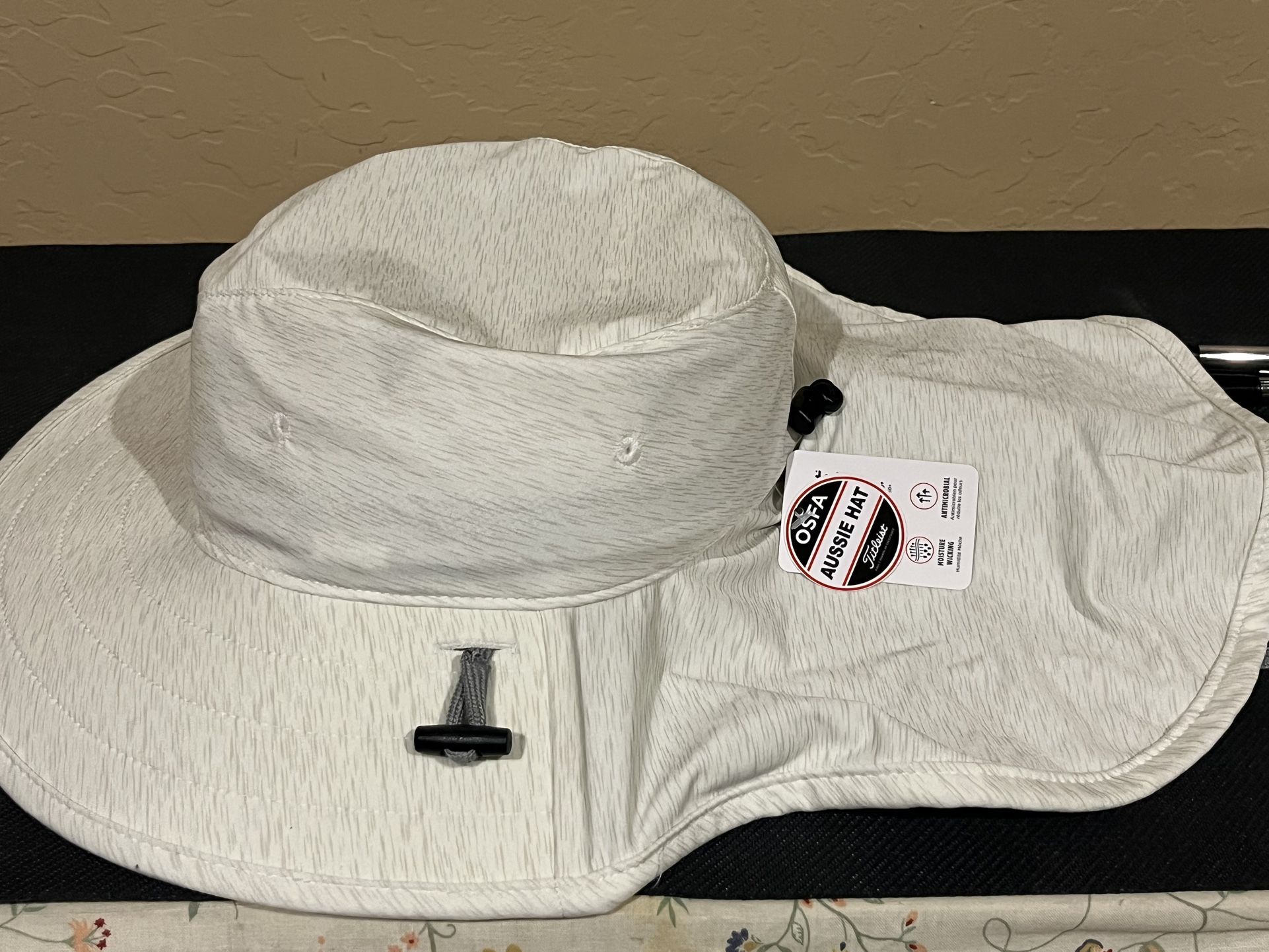 Brand new Titleist Aussie hat. The back of the hat extends to cover the neck to keep you cool and protected from the heat. One size fits most. Price tag is $55, get yours for $45, and no taxes. 3 available in this color. Get ready for that AZ heat by looking great and staying cool.