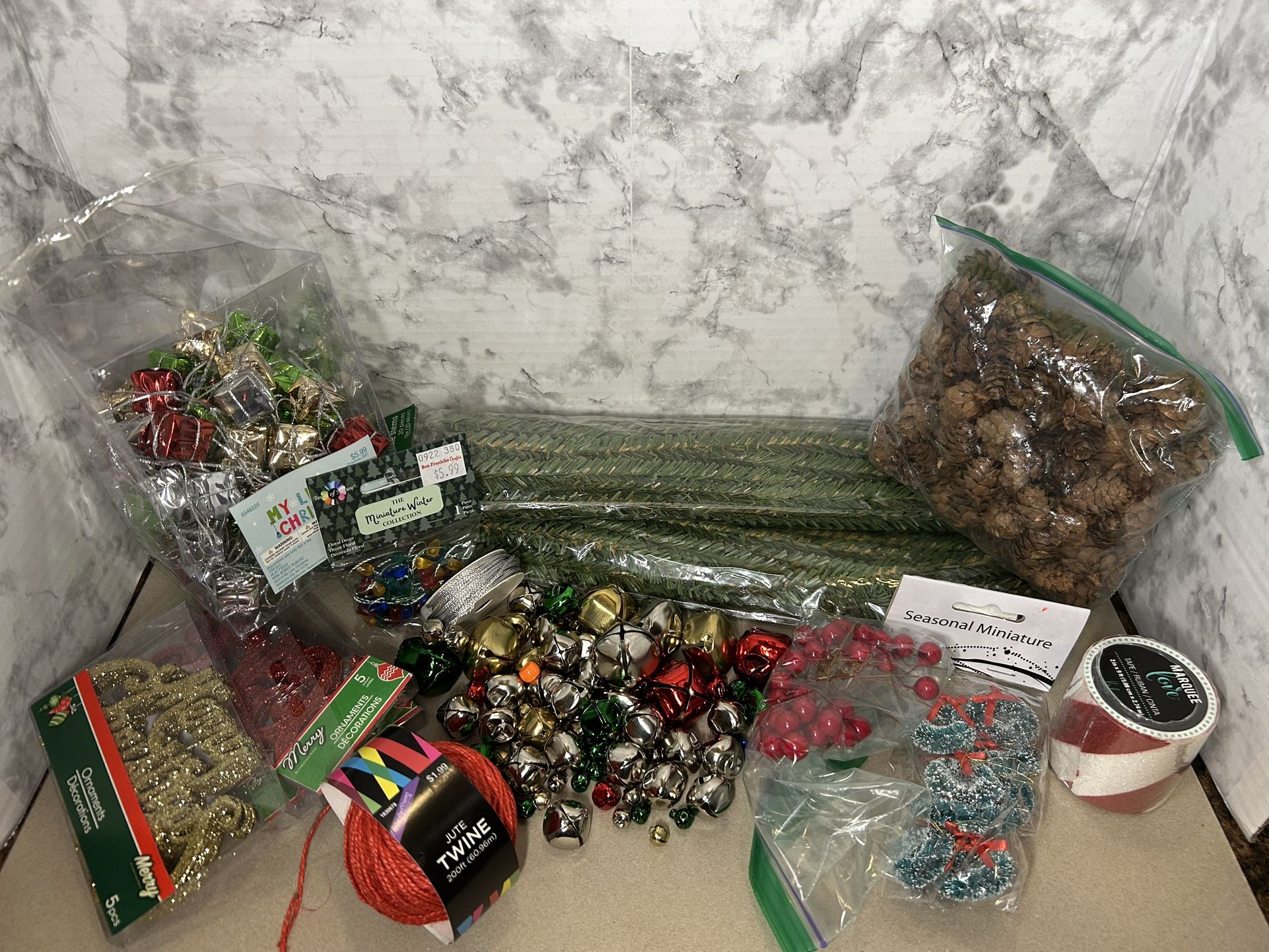 2 unopened packages of 20 Pieces each of Canadian pine stems 3 packages ornaments of 5 each - see images Miniature decorative string lights Package of 8 miniature wreath bag of small pinecones Bag of jingle bells Miniature decoration packages Red twine Ribbon and tape Porch pickup
