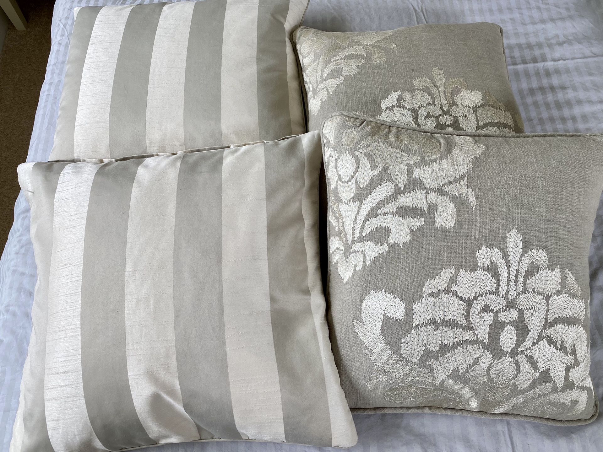 4 throw accent pillows. All have zippers for easy washing And changeable filling. Taupe, beige, brown, cream shine colors. Material is part linen, part silk sown. Great for living room, bedroom, day beds. Stripped are ikea brand 18” and patterns are Villa brand 16”.