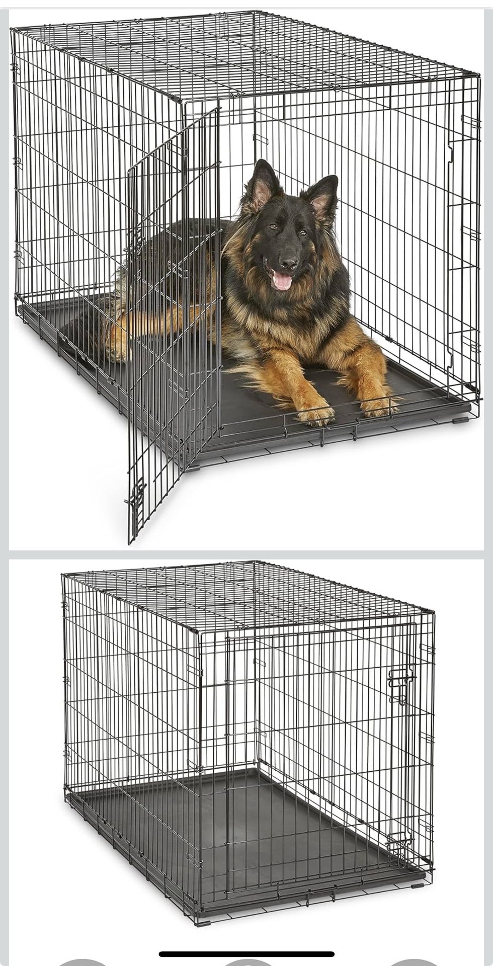 Extra large dog crate. Single door. Metal. We’ve fit two of our German Shepherds at the same time. W=29.5”-H=32”-L=4’. In perfect condition. No holds. You pick up