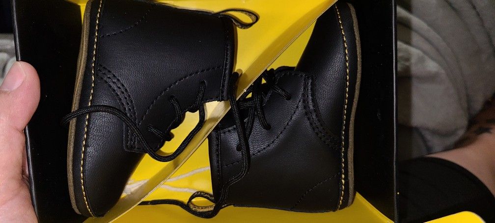 For your newborn rebel who just can't wait to embrace the Docs lifestyle—it's the new 1460 Bootie from Dr. Martens! Perfect for the crib and first steps, these soft-sole booties feature supple PU-coated Auburn leathers with signature yellow stitching, lace closure, and a soft leather outsole with the text "When I grow up I want to be a 1460." Size 3c New never worn $25 FIRM