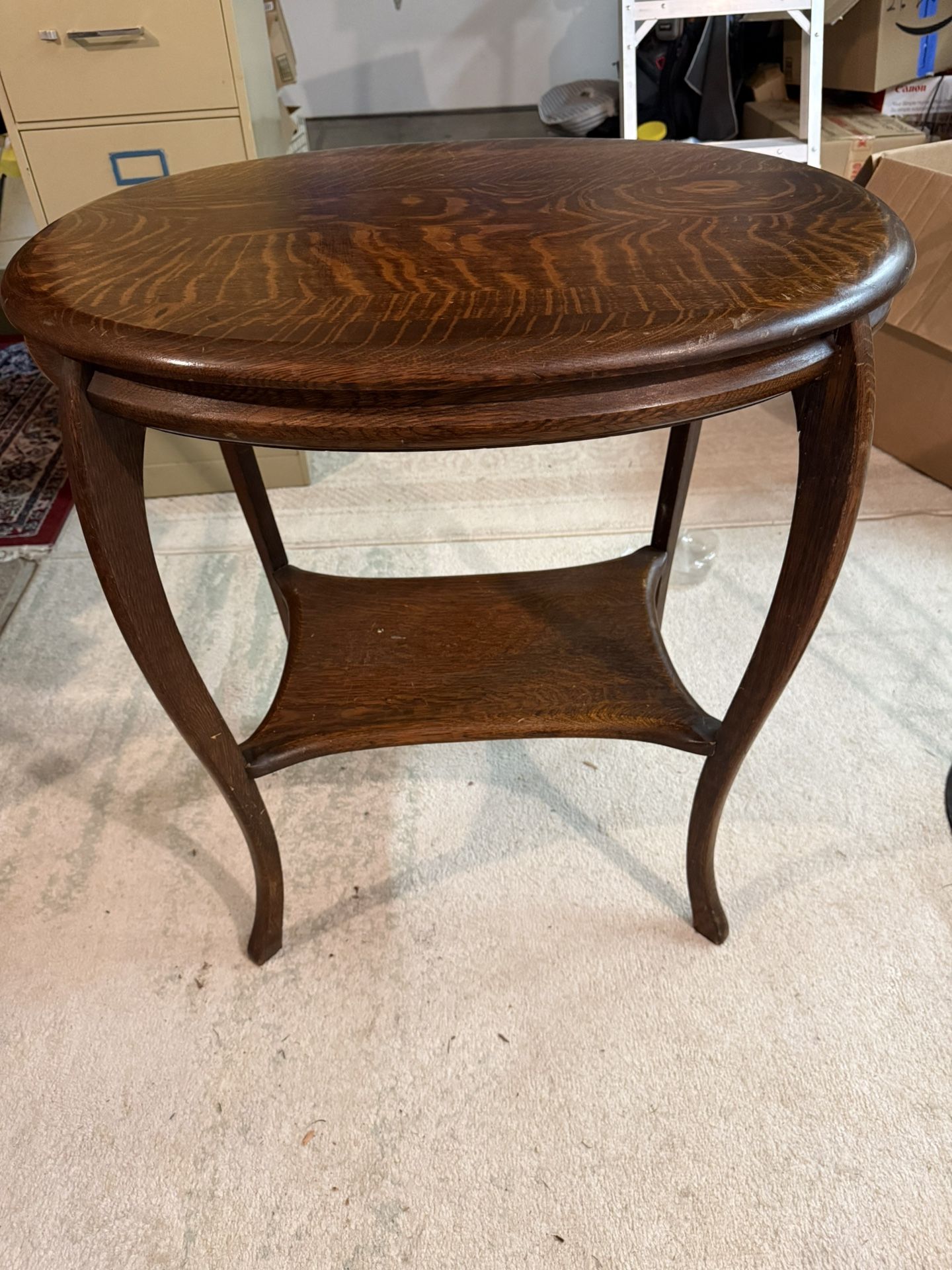 This queen AnneVictorian tea or parlor table circa 1890 to 1910 has been in my family for generations. I'm moving and must sell. The hardware on this table is pre-World War I. The serpentine-shaped cabriole legs (those graceful S-curves) puts it firmly in late Victorian design, not Colonial Revival. It is an excellent condition and has not been refinished. it is solid oak throughout and it's very sturdy. It has a Hand-shaped top edge with a soft ogee profile. a beautiful antique pieces for anyone's collection. This would retail in a high-end antique shop for six to $800. I'm only asking $400 or best offer. 22x28" oval top 30" tall