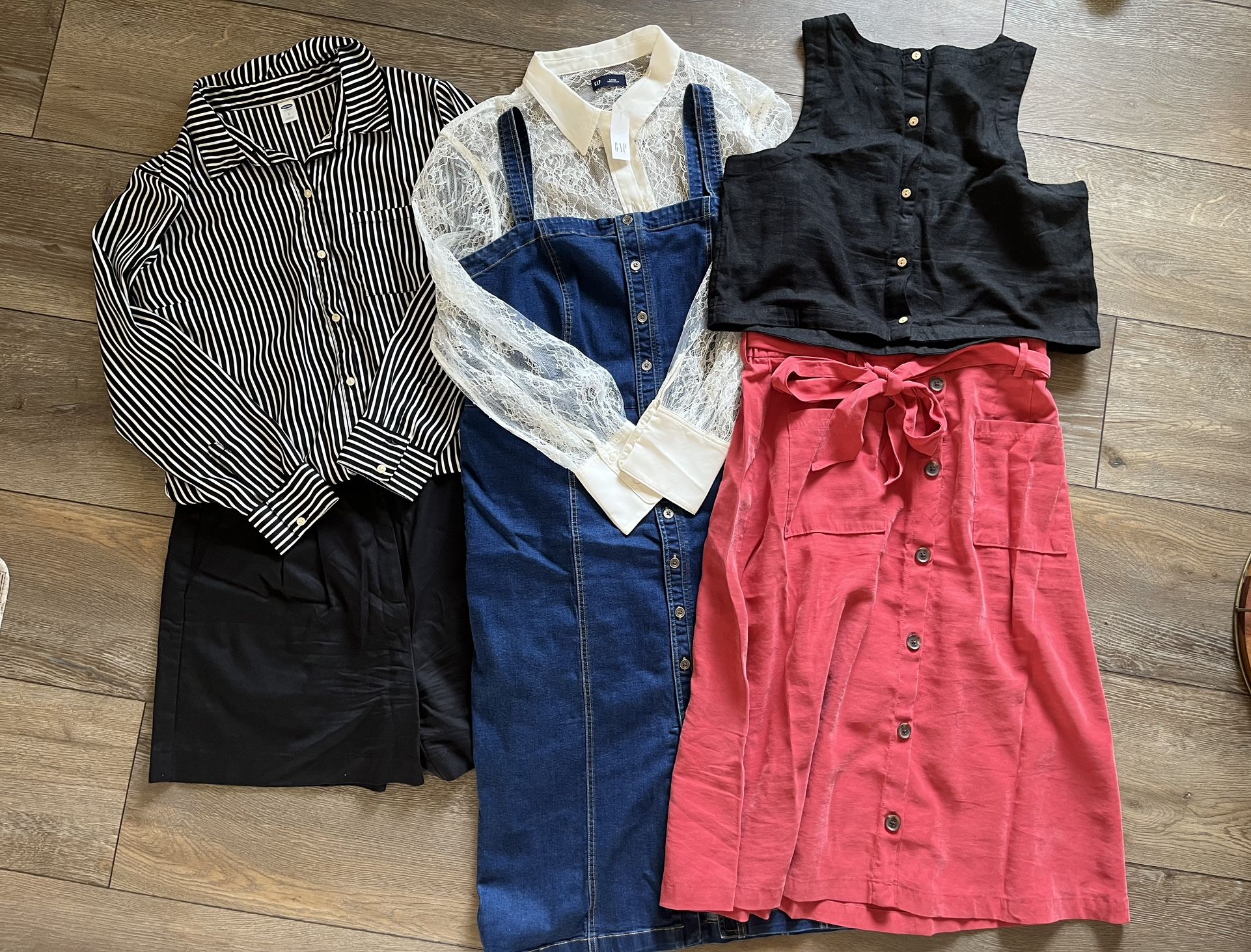 XPOSTED/ TROUTDALE/ PICKUP All pieces in Excellent condition. Size Large, fitting best for a women’s 12 or fitted 14. Included is: Button detail sleeveless tank Button detail waist tie skirt Pin stripe button up shirt Tailored black short Denim high stretch button detail dress Lace collared sheer button down blouse Some great versatile business casual pieces! All together for $25, no long holds.