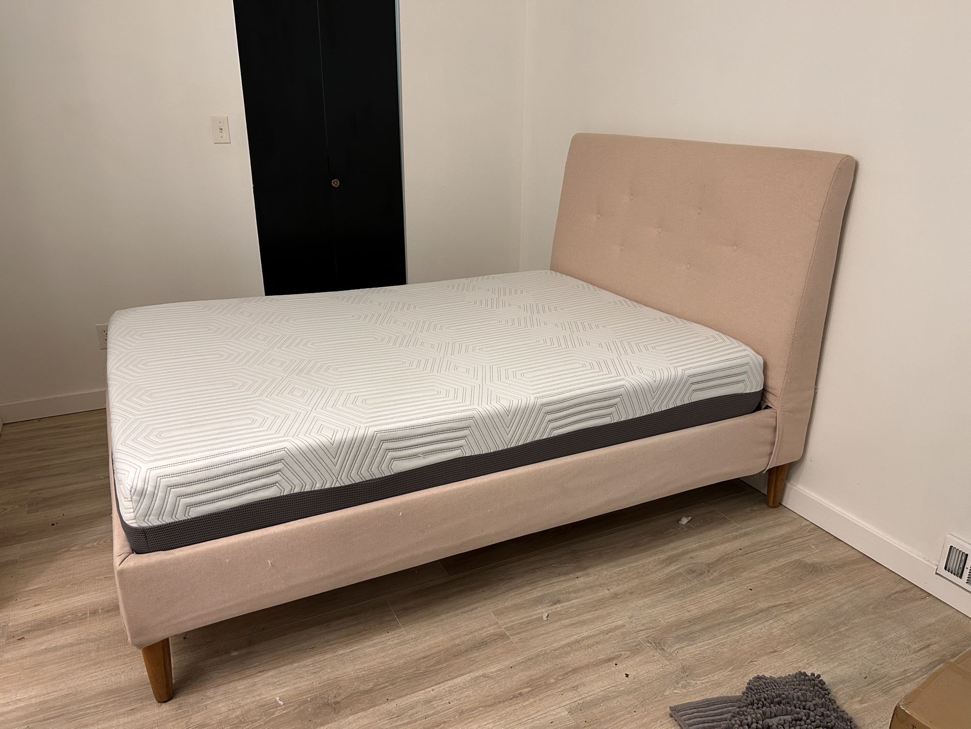 Full size ikea mattress in great condition. Medium firmness. Full size light pink bed frame. Dimensions are 81” long x 55.5” wide x 47.5” tall. Some minor wear and tear as seen in photos.