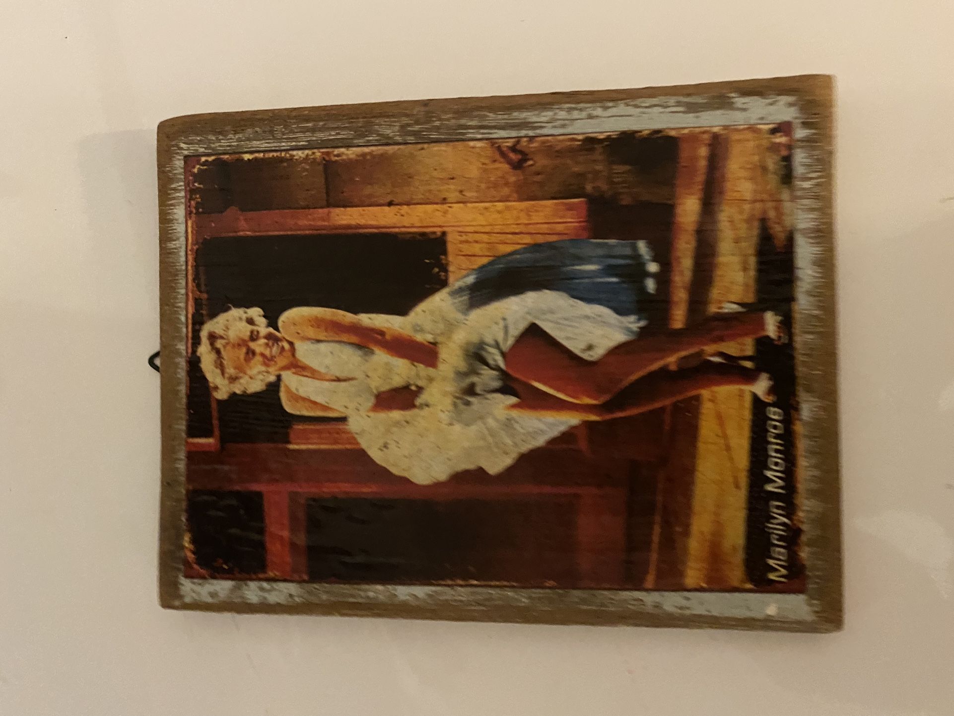 Small wooden Marilyn Monroe wall art with metal triangle for hanging. No damages to this piece.