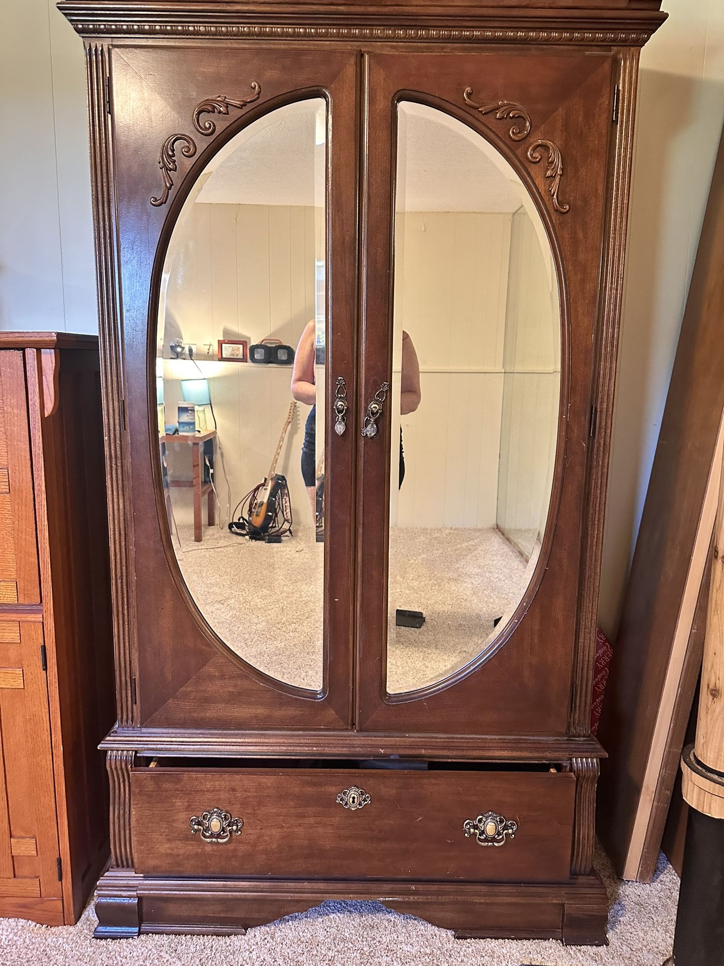Solid wood armoire. One interior drawer and one drawer on the bottom. This is a solid wood piece of furniture. Perfect for a room that lacks storage. You can remove the shelves and use a tension rod to create closet space. H 76.5” L 42” W 22.5” $100 OBO. Pickup only. You will need a truck, a furniture mover and at least two strong people to move this