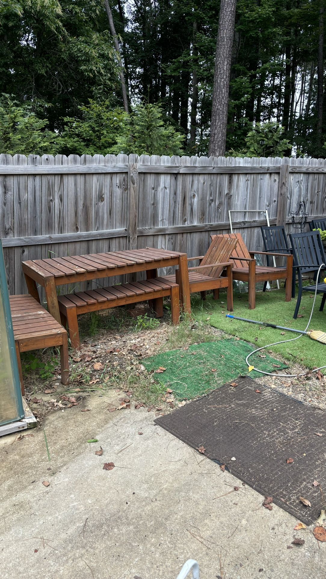 Wooden table 2 benches and two chairs in good condition