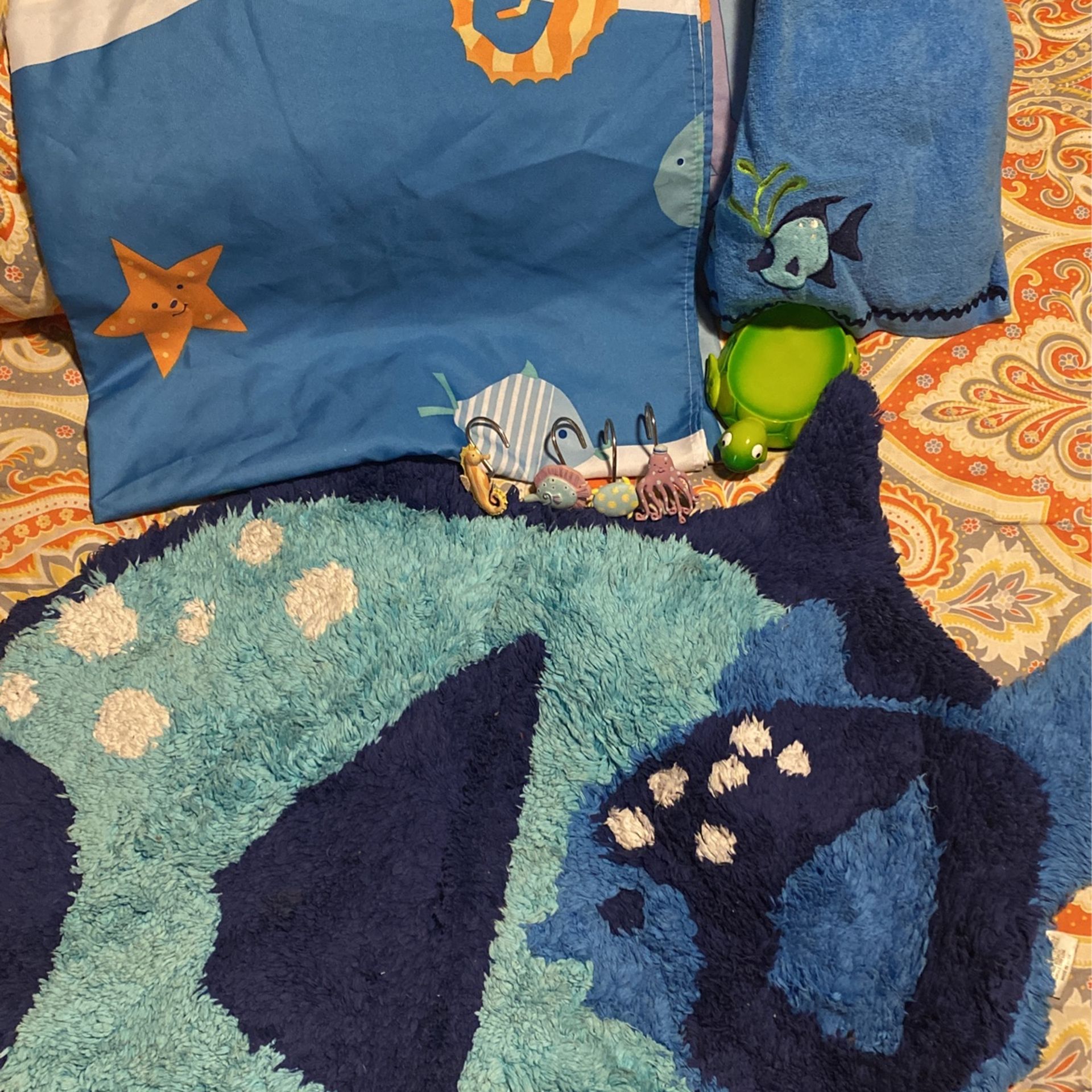 100 % polyester curtain shower, carport fiber 100% cotton, 2 hand towels 100% cotton, hand soap holder and 12 curtain hangers