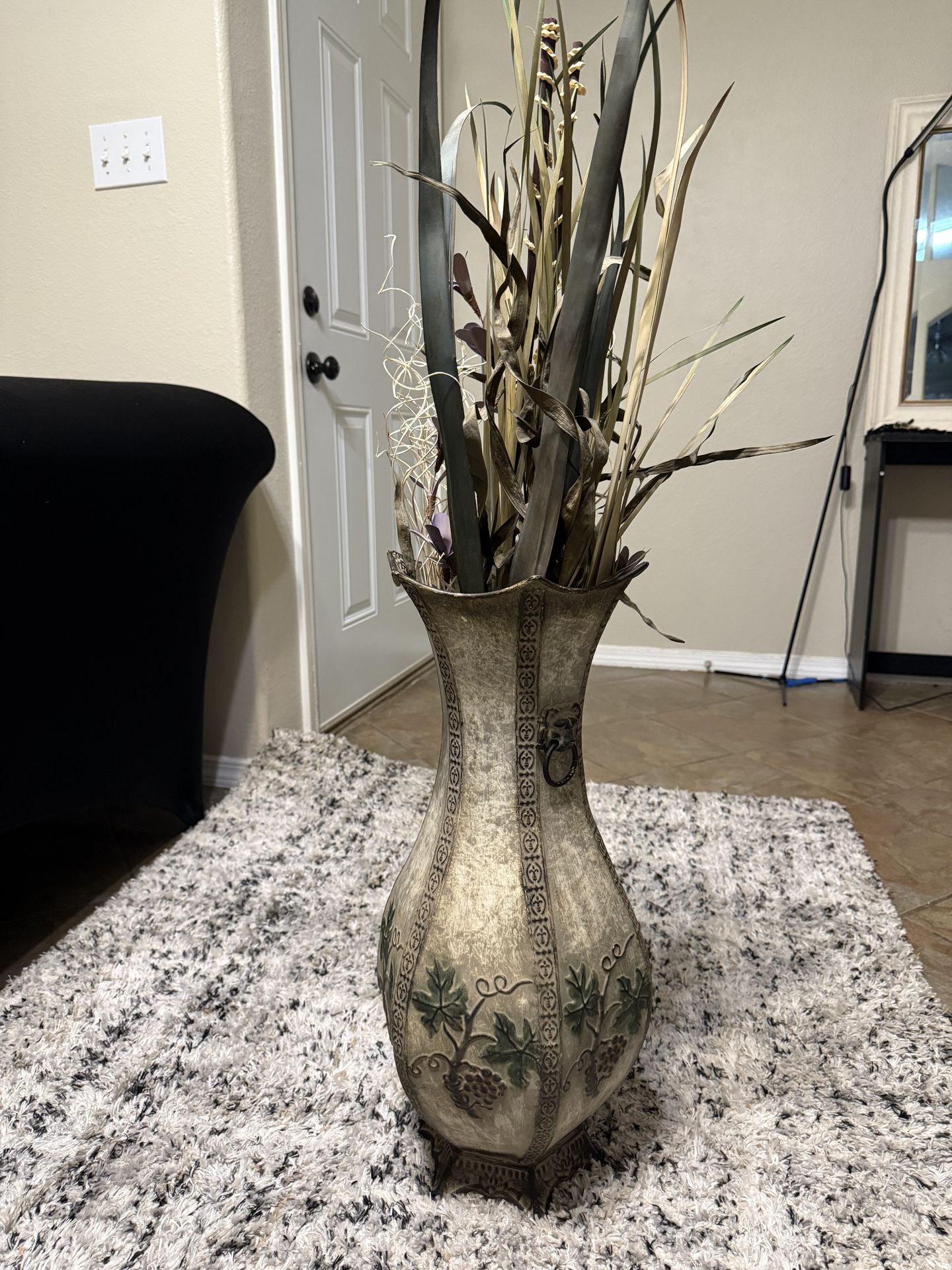 Metal rustic/vintage large vase with dried grasses included 24”tall, aprox 15” wide on the bottom $40 obo. Has a small dent shown on picture can’t really tell.