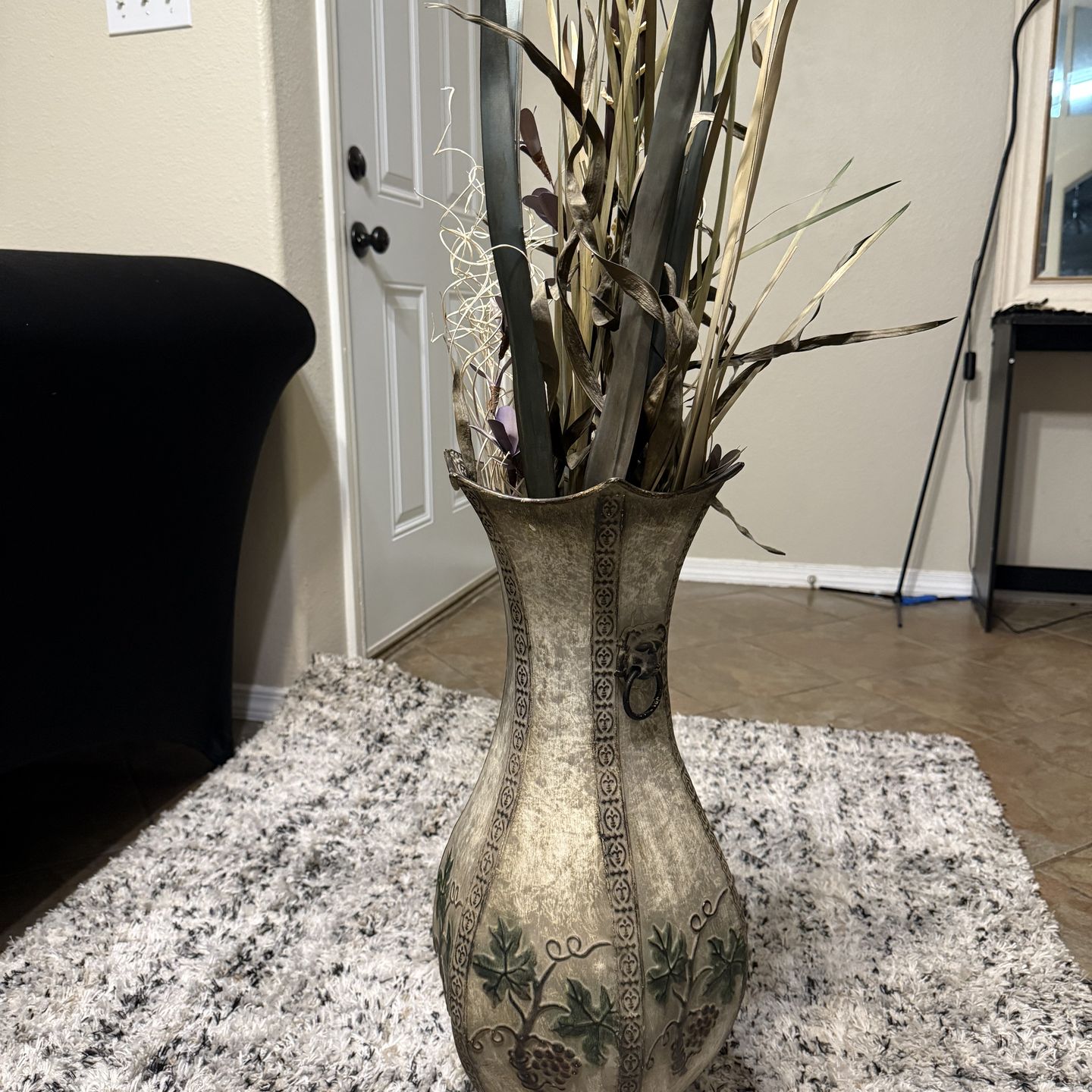 Metal rustic/vintage large vase with dried grasses included 24”tall, aprox 15” wide on the bottom $40 obo