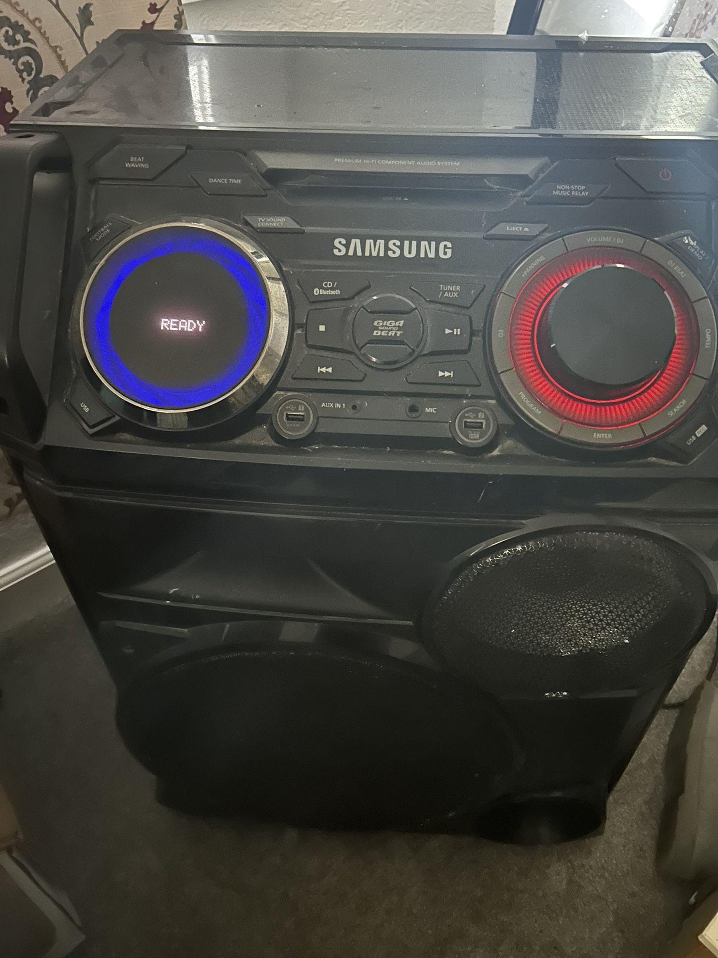 Samsung MX-HS8(contact info removed)W Output Power With a combined output power of 2500W, this sound system is suitable for parties. 15" Subwoofer The large 15" subwoofer adds depth and power to sound. Mobile Design Thanks to the wheels and handle, this sound system offers mobility and convenience. Crystal Amp Plus The Crystal Amp Plus feature filters out distortion and noise, thereby enhancing the sound quality. DJ Beat Effect The DJ Beat Effect function allows you to mix, mash, and share your music. With dual jog dials you can easily control the sound and add the atmosphere and effects of a club to parties. Beat Lighting Effect With lights that pulse and flow to the beats of music, you can add a nightclub feel to your party. The 25 different lighting patterns allow you to fit the lights to the mood of the song. Soccer Mode The Soccer Mode adds realism to sports broadcasts and captures the excitement of the stadium. The Stadium function enhances the roaring cheer of the crowd, and the Announcer function enhances the match commentary. You can even turn on lighting and sound effects that add to the excitement. Bluetooth Connectivity & Power On If you want to stream music from your portable Bluetooth device (for example, a smartphone or tablet), simply pair it with the sound system and it will automatically power on and begin playing. TV SoundConnect The sound system can connect wirelessly to select Samsung 3D TVs, which allows streaming audio from the TV. The speakers add impact to movies and streamed music. Select 2013 and 2014 Samsung 3D TV models Virtual Sound The LED lighting on the speaker and volume control adds visual effect to the sound. USB Connectivity The provision of USB ports allows you to play audio files stored on a USB memory drive or external hard drive (flash memory and hard drive not included). My Karaoke You can use the My Karaoke function to sing along with your favorite CDs and songs stored on your USB memory drive. Other Features Crystal Amplifier Plus, EZ MP3 Maker, LED flash volume, LED flash speaker, beat waving, Giga Sound (beat), USB/CD auto change, DJ Beat effect 0