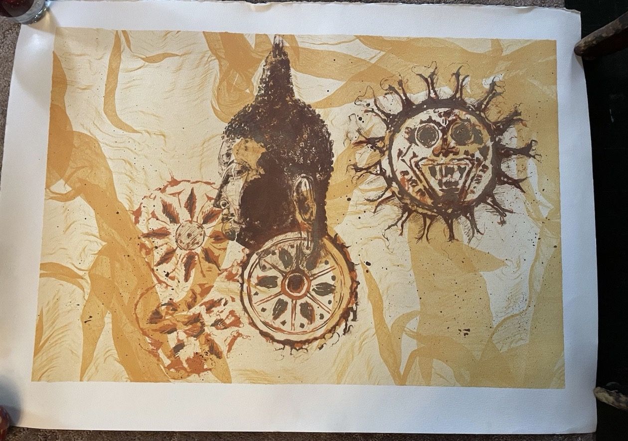 The product is a 22 x 30” watercolor painting print of a spiritual Buddha-like figure. Appears to be new. The artwork combines elements of Realism, Indian style, and Modernism, featuring a portrait of a religious nature. Created on paper using watercolor painting technique, this original print showcases intricate details and hues that reflect the artist's vision of the subject. The image of Buddha is a symbol of peace and inner wisdom and is known to inspire tranquility and a sense of well-being. This print will be a beautiful addition to any meditation space and will serve as a reminder to take a moment for yourself and find a sense of inner peace. Whether you're looking to decorate your living room, bedroom, or office, this watercolor Buddha print is a perfect choice. It's not just an ordinary piece of art, but a daily inspiration to find balance and inner peace in your life. Buddhist iconography, specifically: The central figure is a profile of the Buddha's head. Two representations of the Dharmachakra, or "wheel of dharma," are visible, symbolizing the Buddha's teachings. To the right is a depiction of a sun with a face, which may represent a specific deity or a cultural symbol related to the artwork's origin. The work uses warm, earthy tones, primarily ochre and brown, with a textured, possibly screen-printed or lithographed, appearance.