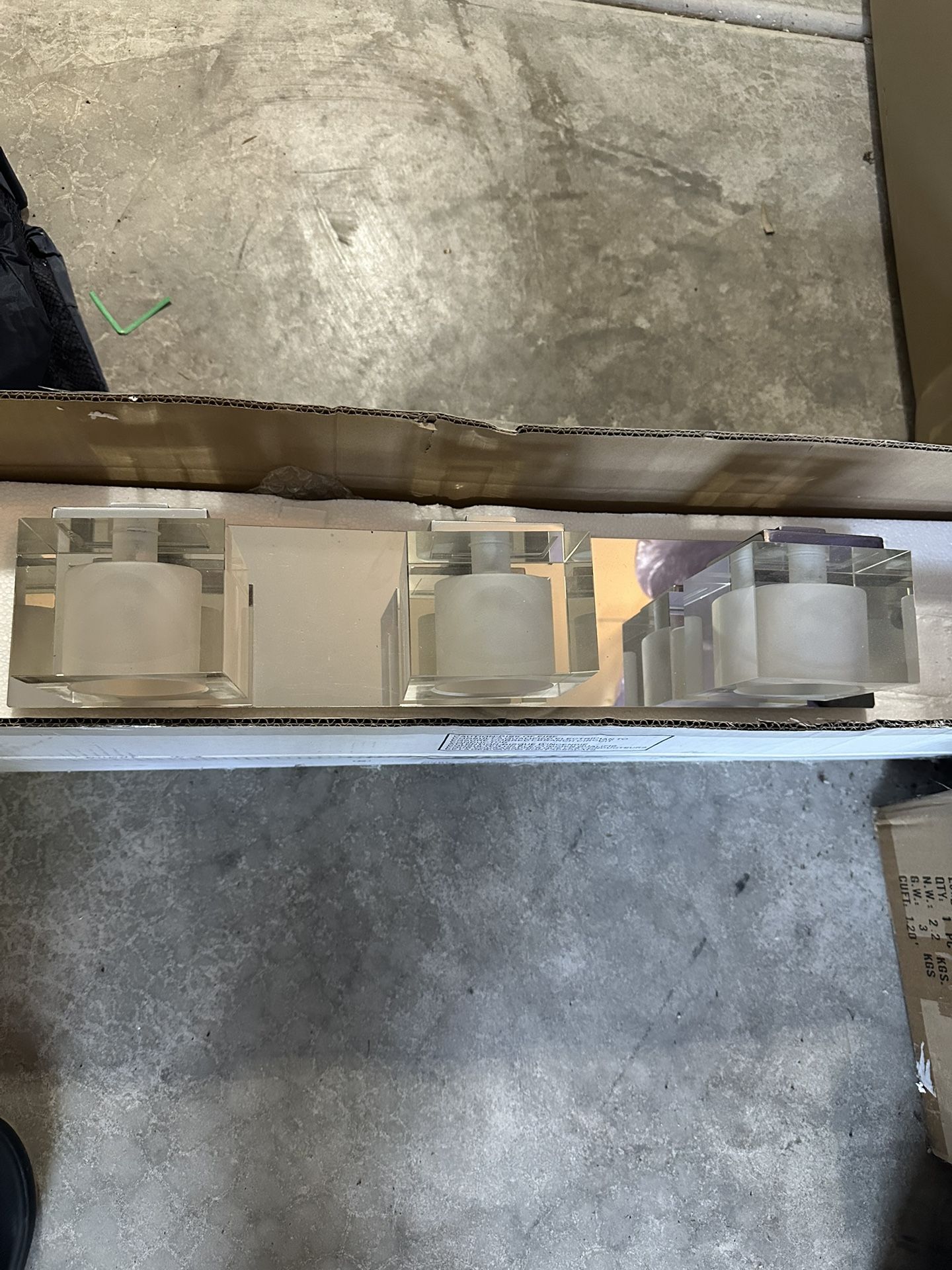 This came with my parents’ house originally, but they had it replaced. There is absolutely nothing wrong with it, and it still fully works. My parents personally never liked the style, and opted for something different. From Maxim Lighting’s website: Cubic collection's bold Clear crystal cubes are mounted on a solid metal frame finished in a mirror-like Polished Chrome. The inside of the crystal cubes are frosted to nicely diffuse the natural light created from the included xenon bulbs. Material: Metal, Crystal Glass: Clear Finish: Polished Chrome Measurements: 21.5” Wide 4.5” High I can link you to the Maxim Lighting listing that goes for $378. I have also included that listing in the pictures. We are asking $225, but open to negotiations, within reason.