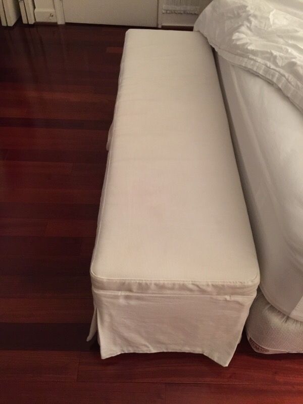 No signs of wear. Removable and washable white cover. Storage capacity inside. 56Lx16Wx19H. White bench, great for any room in the house.