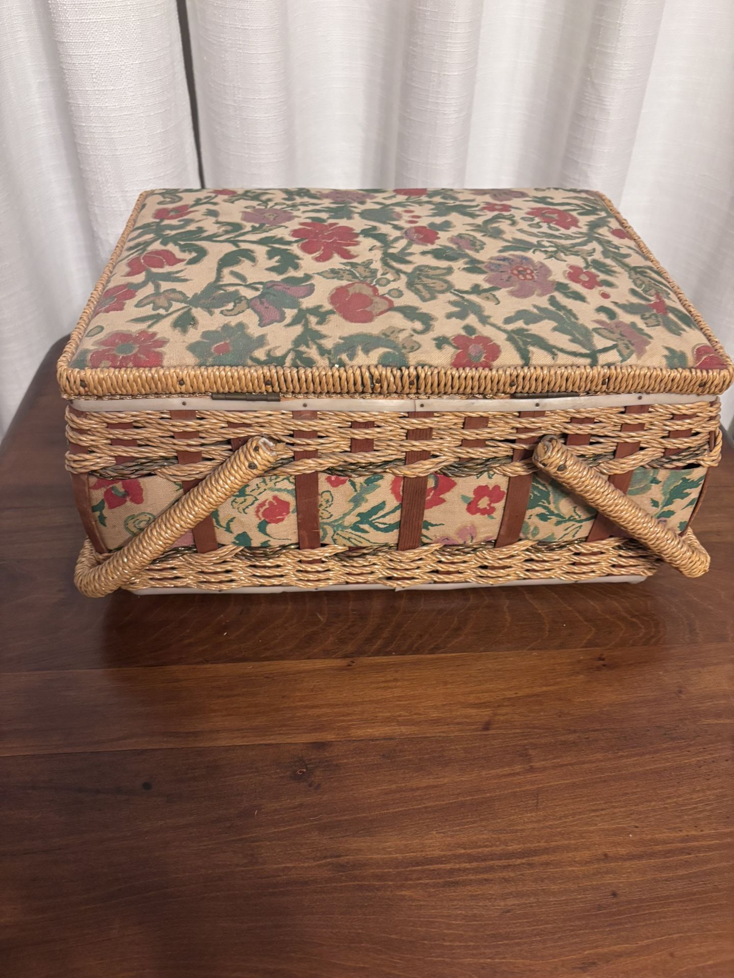 I have a nice sewing basket with two handles and a section that you can put spools of thread pin cushions, scissors, needles, buttons at any other items you would like saved in a sewing basket. Just downsizing and I don’t so much anymore. Also include some nice scissors.