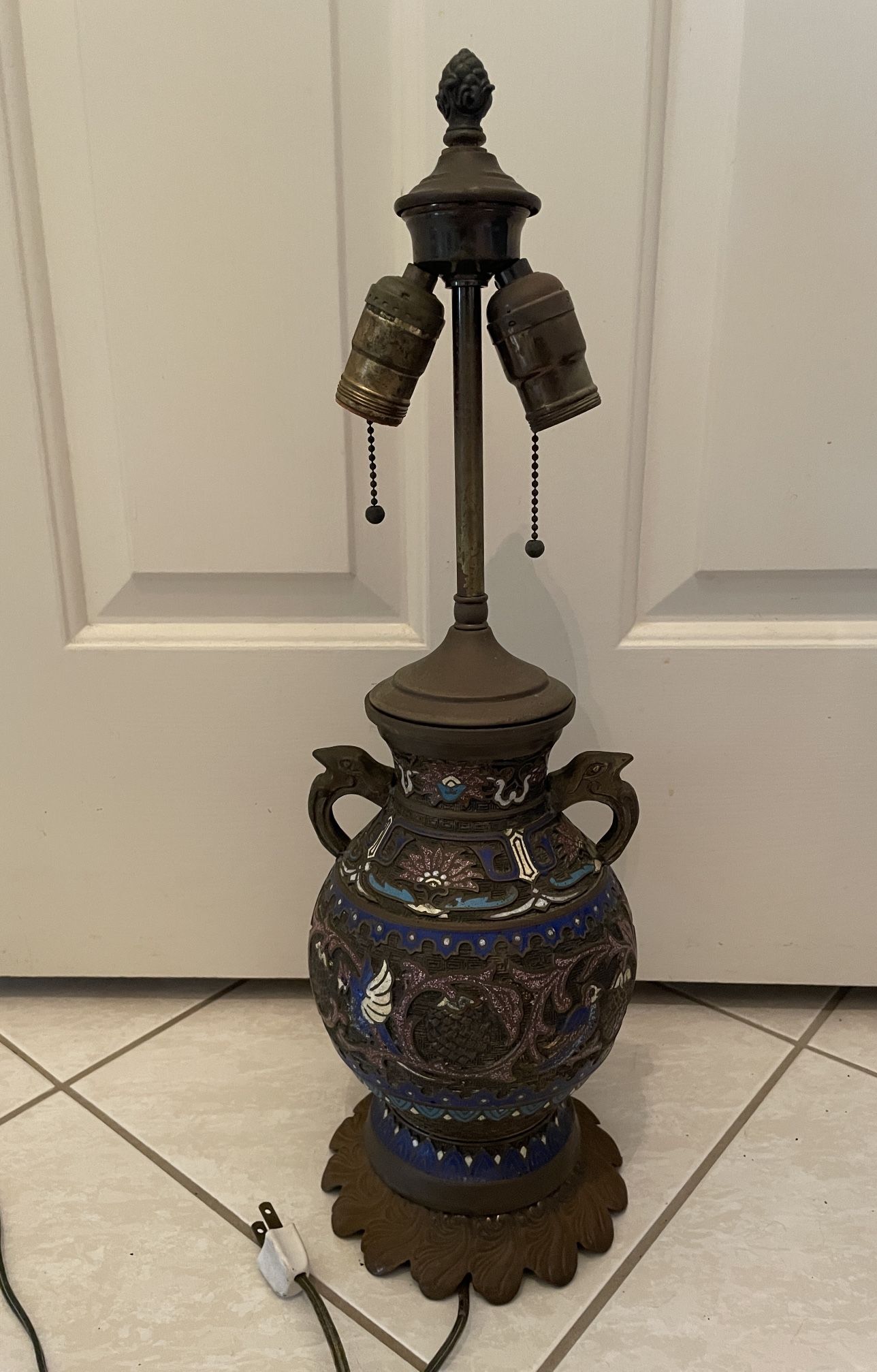 Tested Working Antique Cloisonné Champleve Vase Lamp- 21 In Tall See images for details, condition and measurements Previously used, uses two bulbs, does not come with shade so you can purchase to match your taste. Weighs just under 6lbs Base diameter is 6.5 inch Urn width is approx 7 And actual urn height is around 9 Sold as is