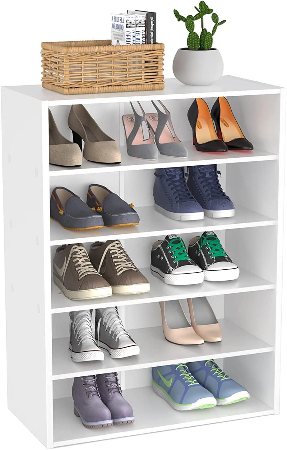 White Shoe Rack, 5-Tier Stackable Wooden Shoe Shelf Organizer Free Standing Shoe Storage Stand with Adjustable Shelf for 10-15 Pairs, Ideal for Entryw