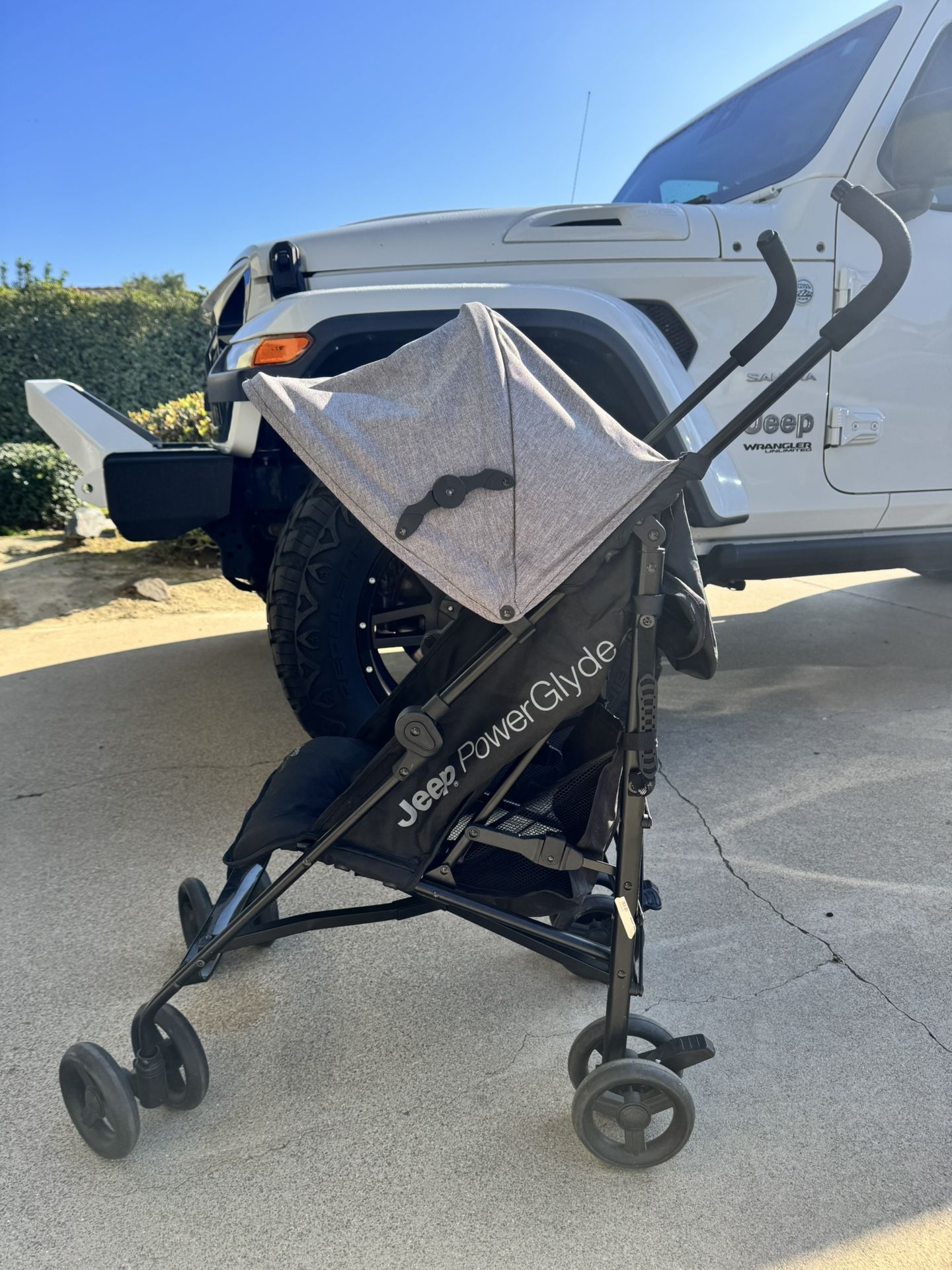 Great condition! Jeep PowerGlyde Stroller by Delta Children Lightweight Travel Stroller with Smoothest Ride & Compact Fold, 3-Position Recline, Extra Large Storage Basket, black and grey