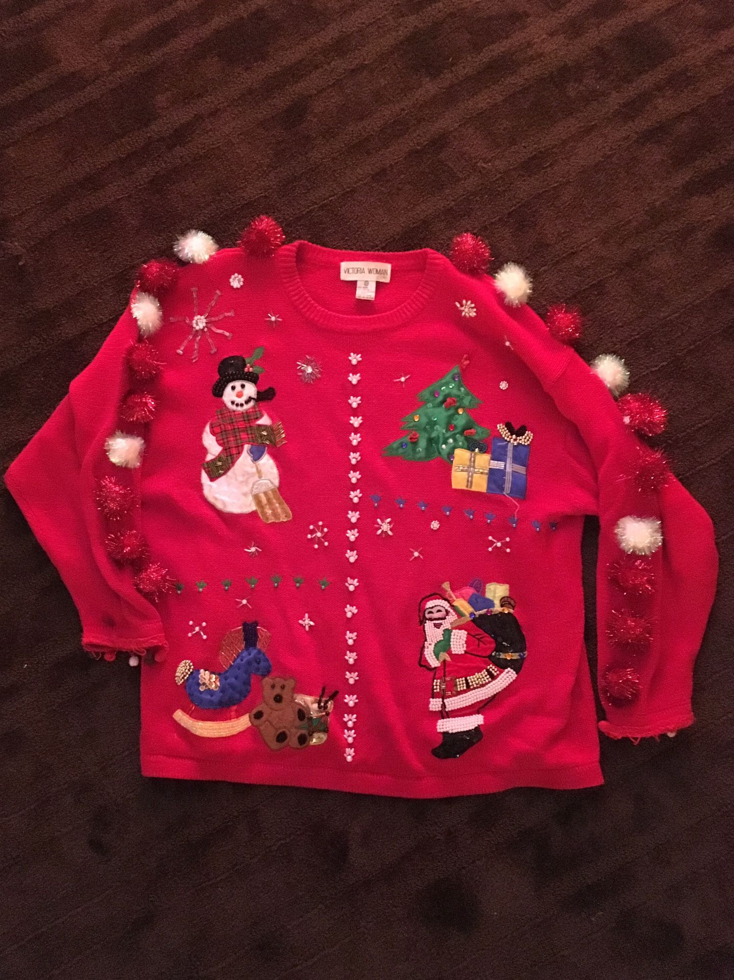 Worn one time. It’s technically a woman’s 2X but my husband wore it to a party. I bought the sweater and then added additional decorations to it!