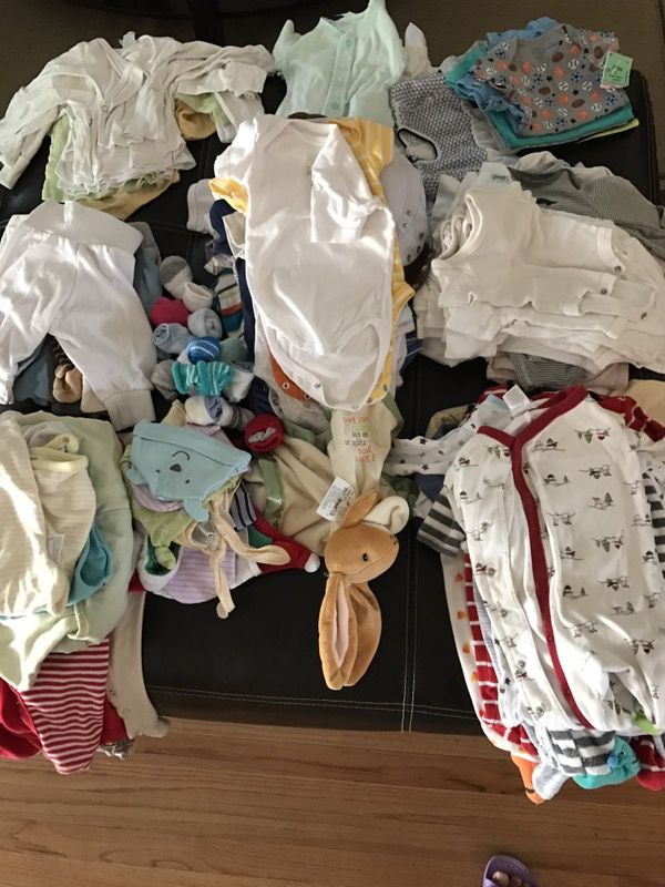 Tons of baby boy clothes. Onesies, pajamas, pants, shirts, socks, hats, bibs. I have way more than shown in the picture. Newborn to 6 months old. All washed and clean. I am a stay home mom. Trying to get some extra cash for buying my baby diapers. Welcome to visit me at home and take time shopping all the baby clothes I have. Your baby is welcome as well. ^_^ $1 a piece. Get a plain onesie when for every five pieces you purchase Super cute outfits for $3 I also have a few girl ones.