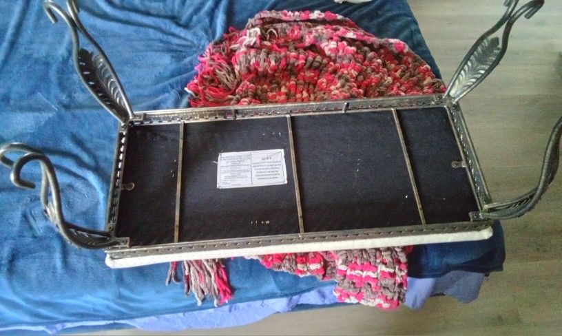 15 inches wide 35 inches long Upholstery top Metal legs Metal bottom support