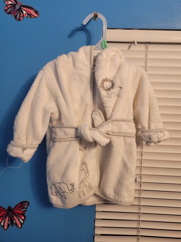 Cute towel for the cutest of the house. It says 0 to 9 months but babies grow up so fast and pass to the next size towel. I used it for 2 months but alternated with the two others So gently used it. Very warm. Unisex.
