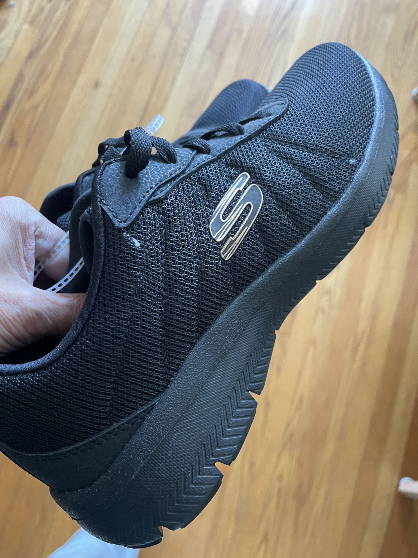 NEW w/ Tags Skechers 7.5 Black Memory Foam Lightweight Sneakers For sale is a brand new pair of Skechers women's sneakers. • Size: US Women's 7.5 • Color: All Black • Condition: New, never worn. Still connected with original plastic tie (see photos). Midsoles and outsoles are perfectly clean. • Key Features: Memory Foam insole for extreme comfort, Lite-Weight construction, breathable mesh upper. Great for walking, light training, or all-day work wear.