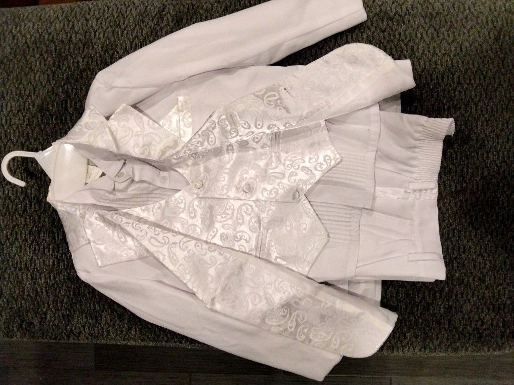 Boys White four piece tuxedo. (Size 7). 100% polyester with satin Paisley collar.