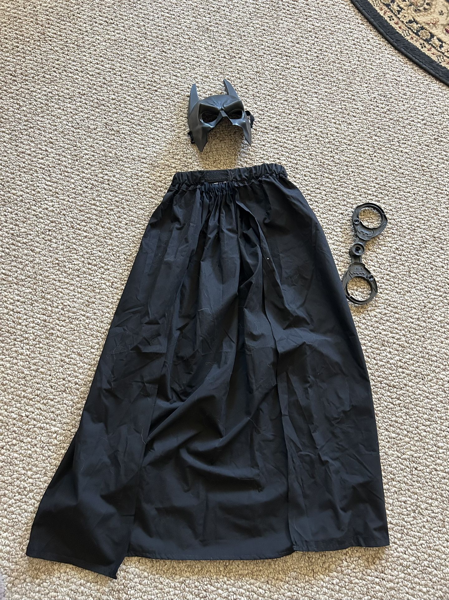 Kids Batman Halloween costume. Includes: cape Batman, mask and Batman handcuffs . In excellent condition.