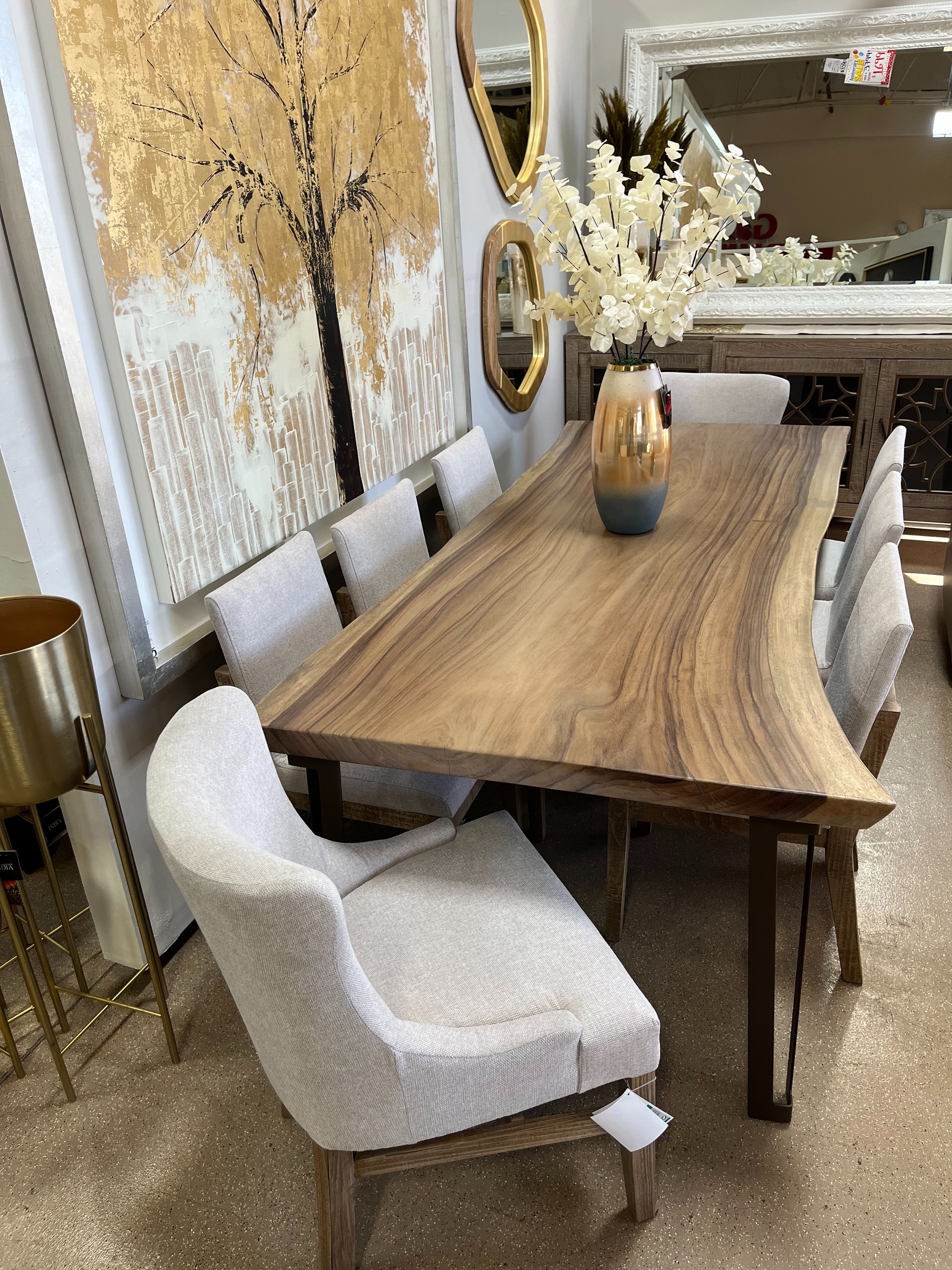Unique Live Edge Solid Wood Dining Table From $2999 Today Special $2249, Upholstered Side Chair $359 and Upholstered Host Chair Special $379. Dimensions: 94.5" x 39.25" x 30"H. FINANCE AVAILABLE FOR GOOD CREDIT, NO CREDIT, OR BAD CREDIT! NO CREDIT NEED IT! The Natural Wood collection is designed to radiate sophistication and timeless elegance, effortlessly elevating the aesthetic of any space. Its remarkable presence is certain to make a lasting impression. This collection showcases the uniqueness and beauty of a live-edge table, adding a touch of natural beauty to your living space. FEATURES: Built from Solid Parota wood. Multi-step clear lacquer coating on top preserves the natural tone of the wood. Our live-edge tables are truly unique, with each one featuring a distinctive form and diameter that's guaranteed to vary. This variation is what makes these tables so beautiful and illustrates the natural essence of trees. You can expect to see natural imperfections, blemishes, and cracks in the wood, which add character to each piece. Additionally, the color variations in the wood contribute to the individual beauty of every table. PLEASE CHECK MY OFFERS I HAVE MORE QUALITY FURNITURE! Sofa, chaise, couch, fabrics, comfortable, sectional, chair, living room, family room, coffee table, End Table, TV stand, Credenza, cabinet, mirror, accent chair, Art Pictures, decorations, lamps, Dining Table, Dining Chair, Wood, Modern, Sofa, Chair, dinette, Patio Furniture, Stool, Chaise Lounge, Standing Desk, Murphy Bed, TV Stand, Accent Chair, Bar Stool, Bunk Bed, Daybed, Coffee Table, Credenza, Buffet, China Hutch, kitchen, Bar Cabinet, Console Table, Sideboard, Folding Table, Accent Table, office, decor, rug, plant, home, house, server, flower, mirror, marble, fireplace, velvet, art, picture, wall, paint, counter, ottoman, bookshelf, desk, file, base, bench, chest, dresser, headboard, mattress, memory, foam, spring, armoire, curio, lamp, light, led.