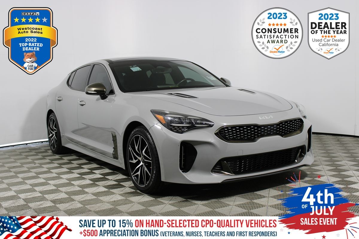 Our One Owner 2022 Kia Stinger GT-Line Sedan with the Sun & Sound Package blends power and refinement in Ceramic Silver! Motivated by a TurboCharged 2.5 Liter 4 Cylinder delivering 300hp to a paddle-shifted 8 Speed Automatic transmission for premium performance you'll love. This Rear Wheel Drive sports sedan also has high-performance dampers for thrilling dynamics, and it achieves nearly 32mpg on the highway. Raring to go, our Stinger looks especially sharp with our package's power sunroof plus LED lighting, alloy wheels, dual exhaust outlets, and aggressive dark chrome accents for its side vents, grille, and heated multifunction mirrors. Buckle up in our GT-Line cockpit and take comfortable control of every drive thanks to heated leather power front seats with exclusive GT headrests, a leather flat-bottomed steering wheel, dual-zone automatic climate control, aluminum pedals, and technology that connects to your world the same way this car connects to the road. Highlights include a 10.25-inch touchscreen, full-color navigation, Android Auto/Apple CarPlay, Bluetooth, wireless charging, and our package's fantastic 15-speaker Harman Kardon sound system. Kia completes the picture with smart safety features such as a backup camera, blind-spot monitor, adaptive cruise control, lane-keeping assistance, a driver attention monitor, safe exit warning, and more. Fire up our Stinger GT-Line and start having fun! Save this Page and Call for Availability. We Know You Will Enjoy Your Test Drive Towards Ownership! Great quality, easy financing and affordable prices aren't the only things that make Westcoast Auto Sales the first choice of many discerning auto buyers. Stop in and See California's Dealer of the Year!