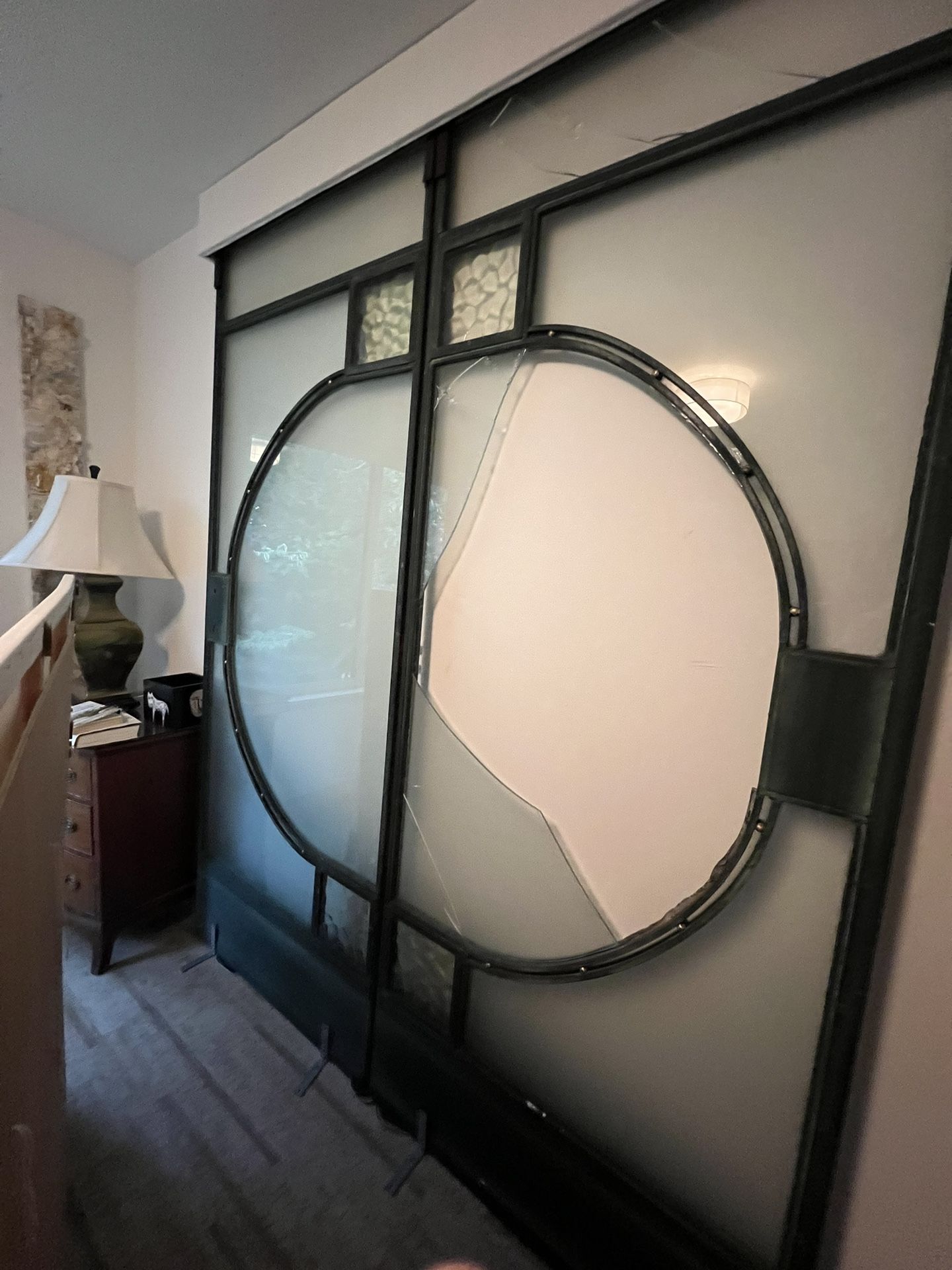 I nought these 2 art deco doors about 20 years ago at an auction of European antiques. I was told they were from an art deco building in Belgium. The metal is beautiful verdigris with coordinating colored glass. They are HEAVY! I loved these for many years, until last year when I stupidly tried to move one by myself and it fell, trapping me underneath it and breaking the glass in the process. I've never felt quite the same about them since. I have done extensive research to find comparable doors, and though none are as beautiful as these, what I have found is selling for more than $4,000. Due to my emotional trauma (and the glass that needs to be replaced, I am asking $1,200 for the pair. Dimensions: 34.5" wide 1-5/8" thick, 87" tall You will need 4 strong people to carry these down some stairs, as well as a truck.