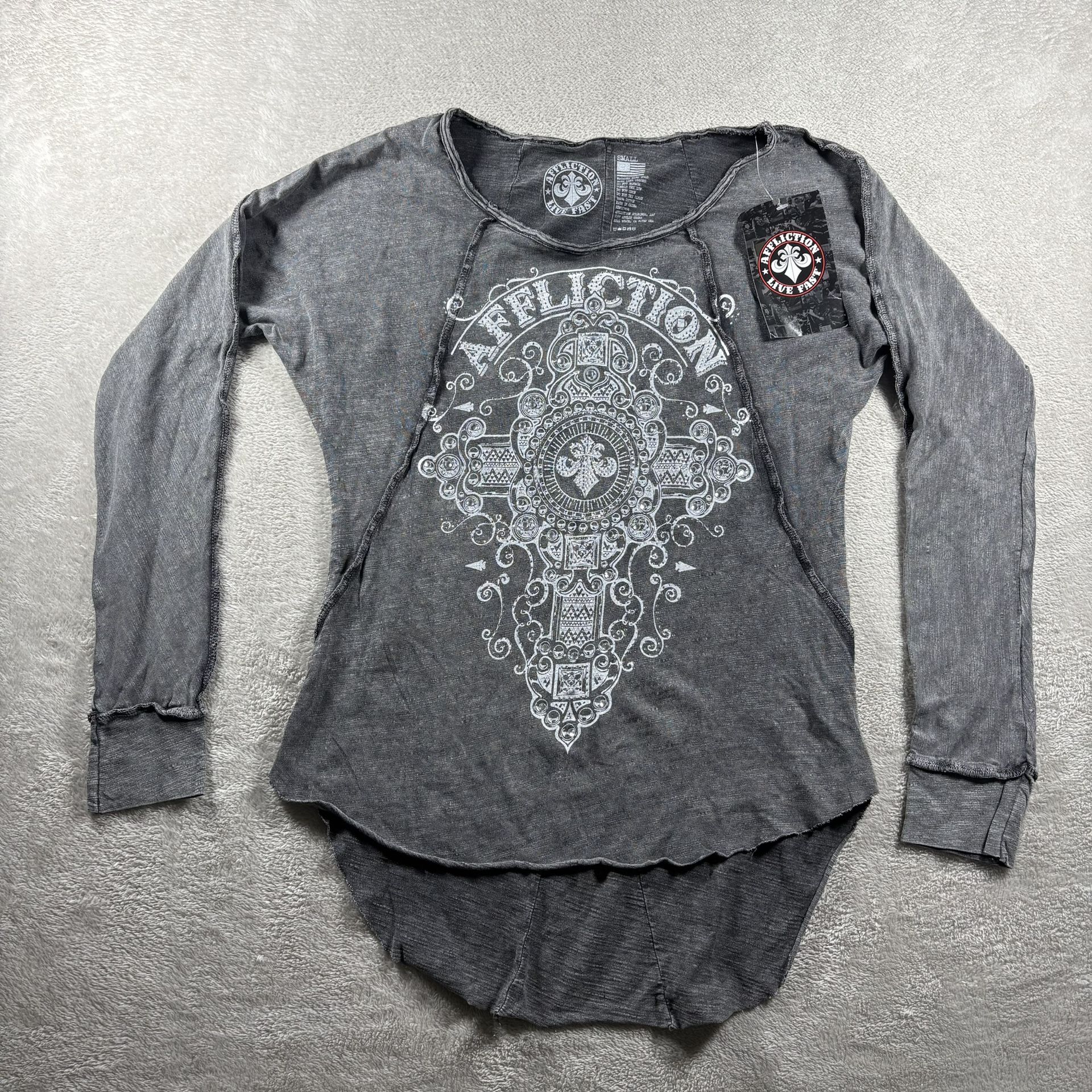 Affliction Marquis Top Women’s Small Gray Rhinestone Cross 3/4 Sleeve NWT Y2K#8F
