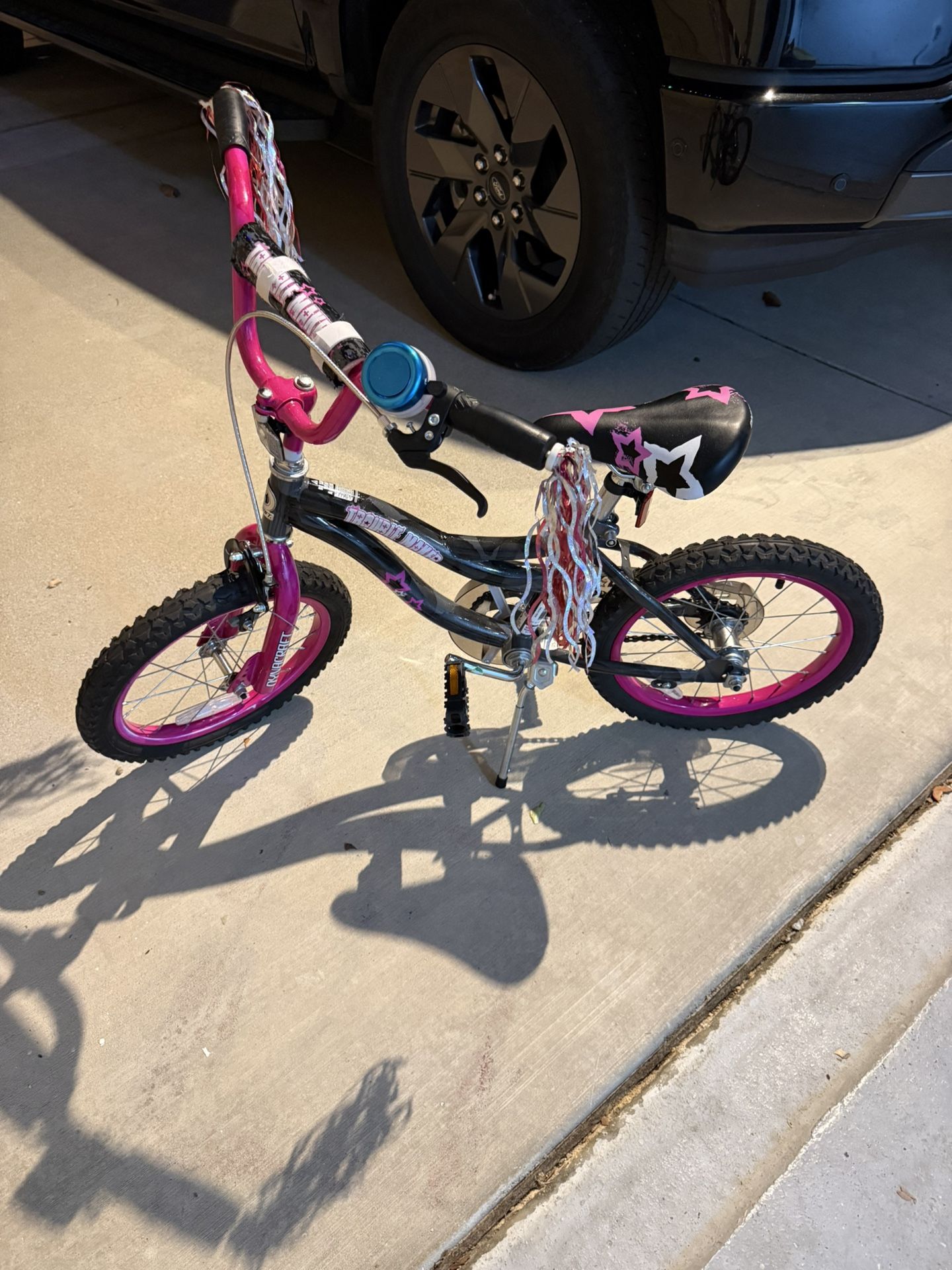 Lightly used girls bike. Sells for 130 new. Daughter grew out of it. Vibrant Design: Sturdy steel BMX frame with bright pink accents and cute graphics, perfect for young girls ages 5-7. Personalized Touch: Includes a custom handlebar bag and colorful mylar streamers for added fun and style. Adjustable Training Wheels: Removable and adjustable training wheels help young riders build confidence at their own pace. Optimal Size: Designed specifically for kids ages 5-7, making it the ideal size for younger riders. Reliable Braking: Equipped with a front caliper brake and rear coaster brake for safe and smooth control. Comfortable Ride: Features an adjustable seat to accommodate growth spurts and ensure a comfortable ride. Stylish Accents: Cloudy black paint effect with pink accents adds a splash of panache to each ride. Free, kitchen, chairs, white, fabric, antique, new, delivery, queen, king, sofa, couch, table, tall, bed, twin, bedroom, furniture, ikea, Wayfair, Amazon, cheap, expensive