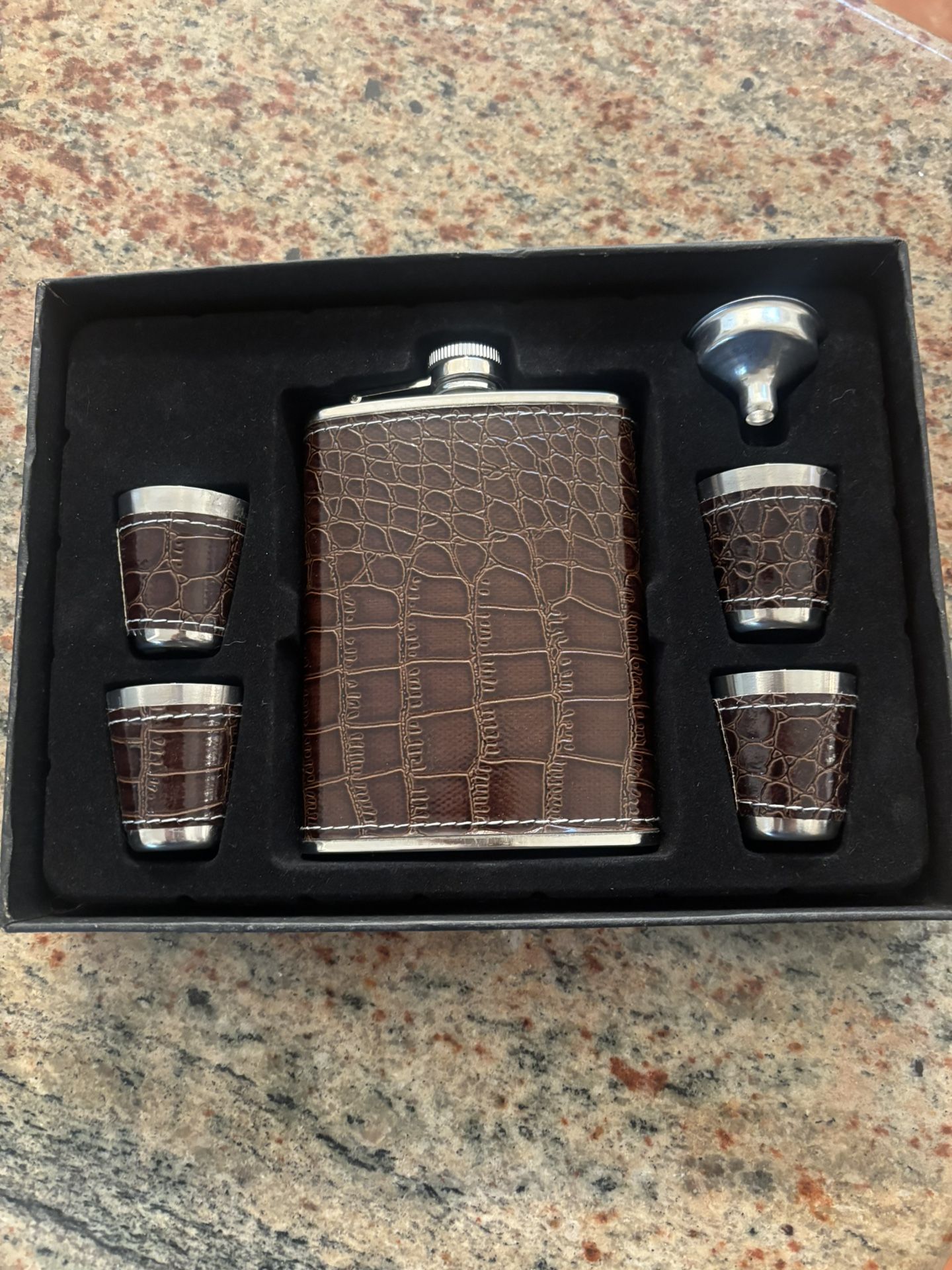 BROWN 6PC SET INCLUDES FLASK, SHOT GLASSES AND POURER. FAUX LEATHER FNISH, DARK, Moderate